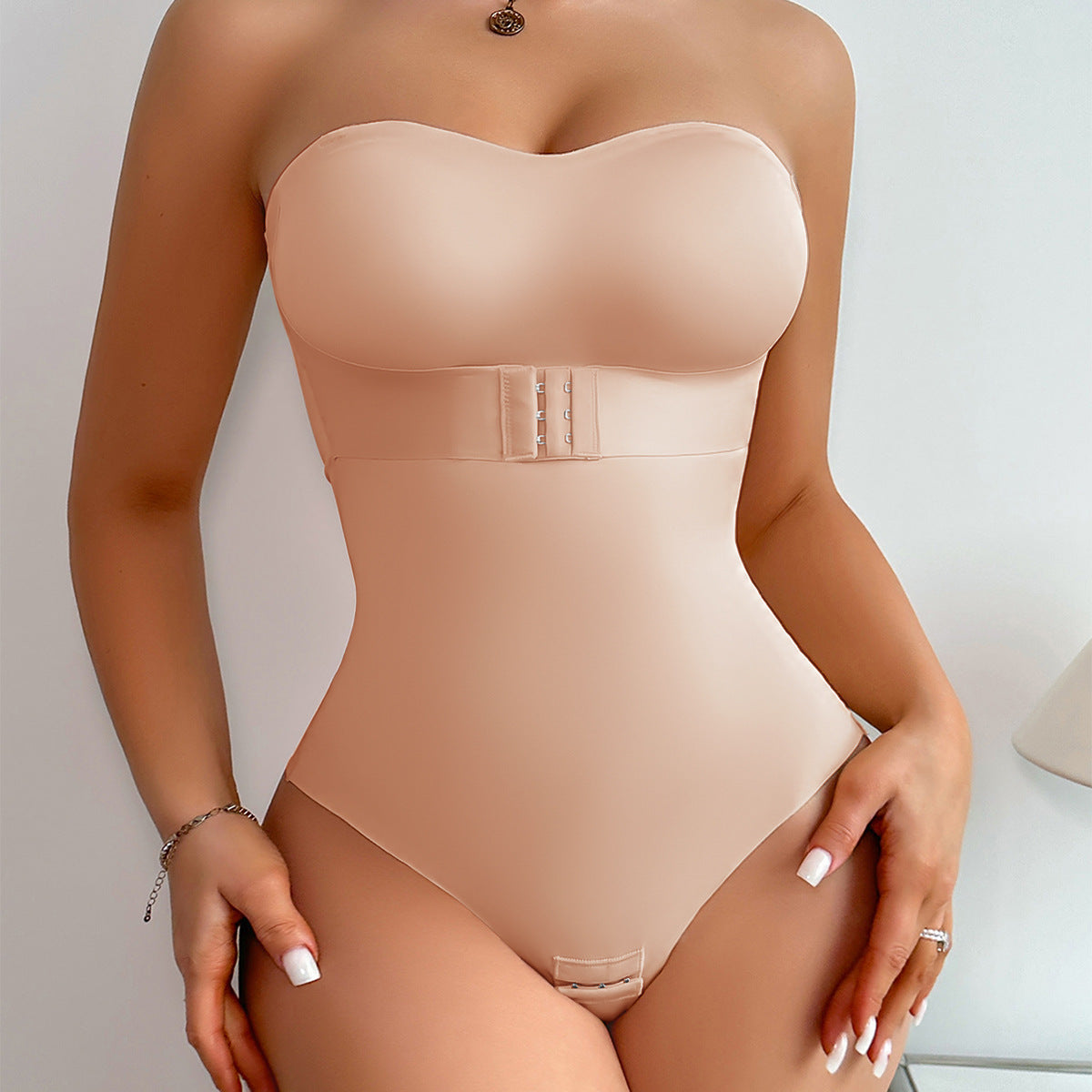 Invisible shoulder straps, anti-slip strips, tummy control, buckle, compression waist trainer(CL12404)