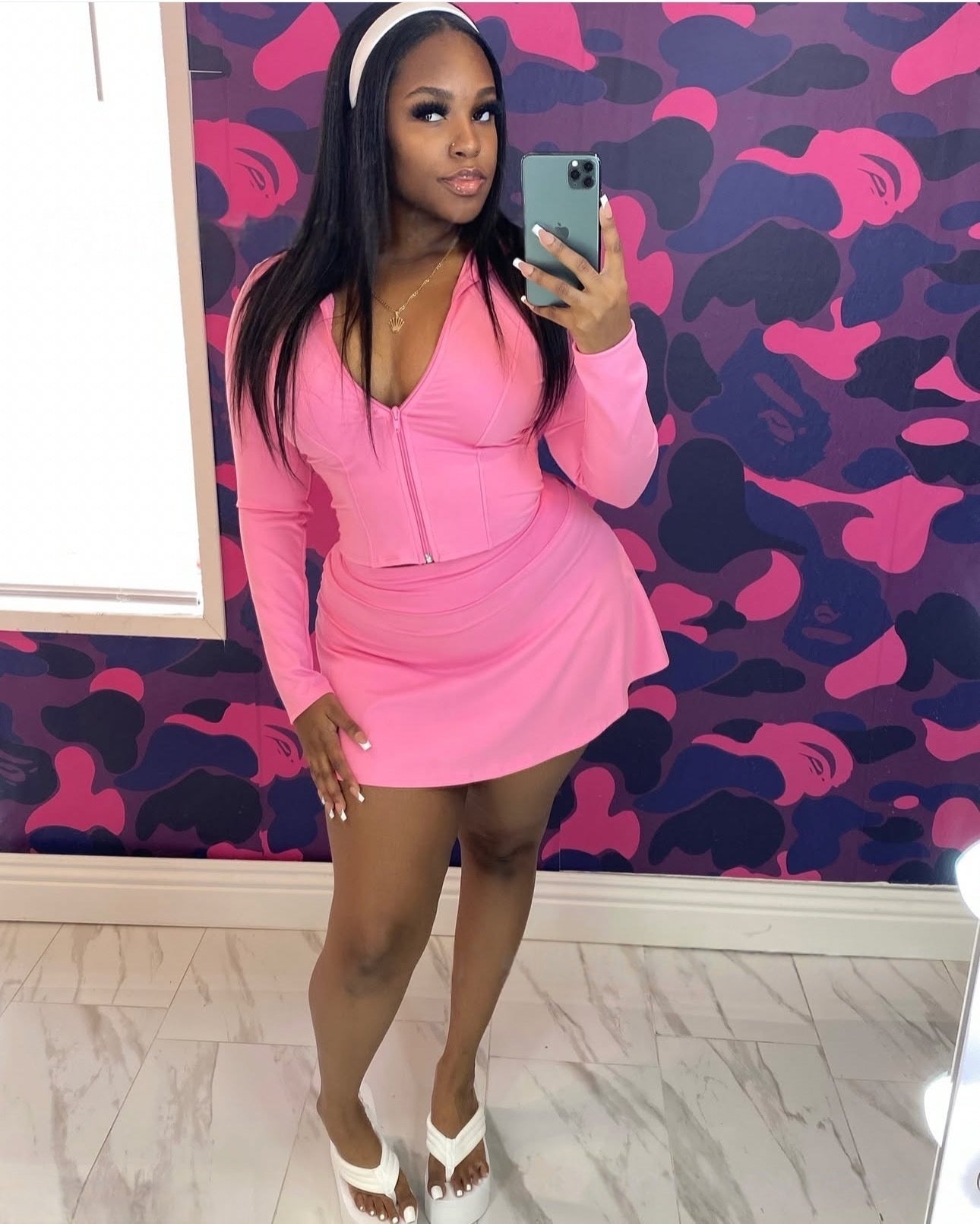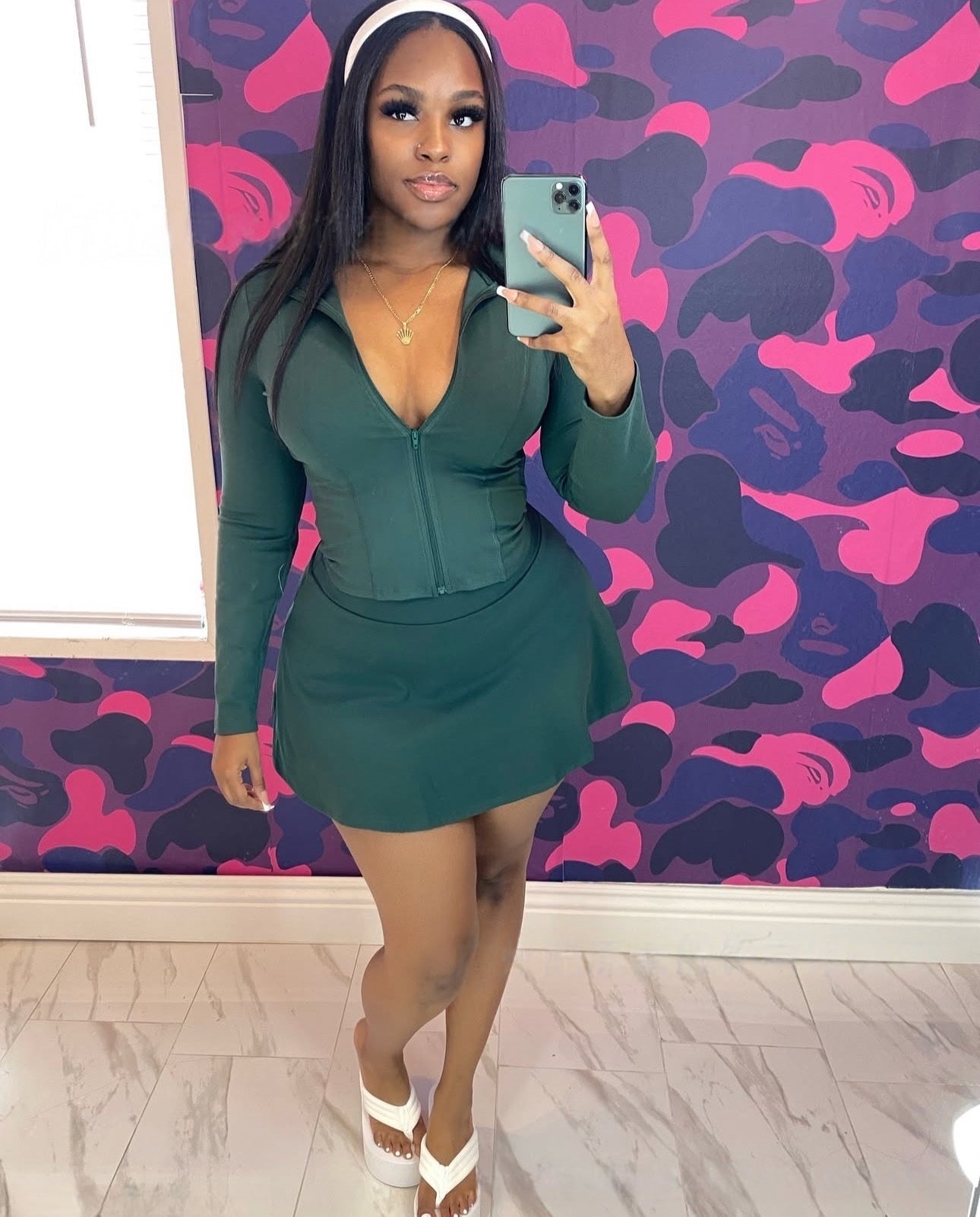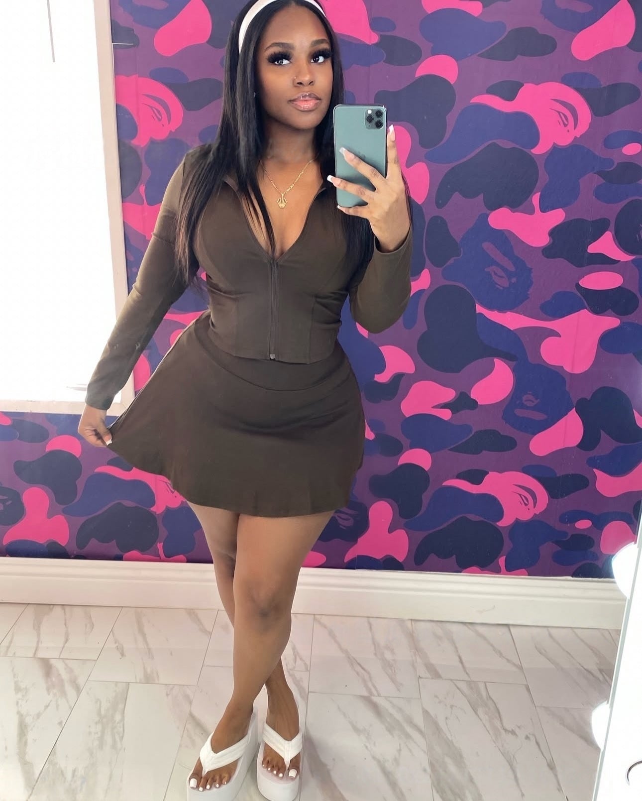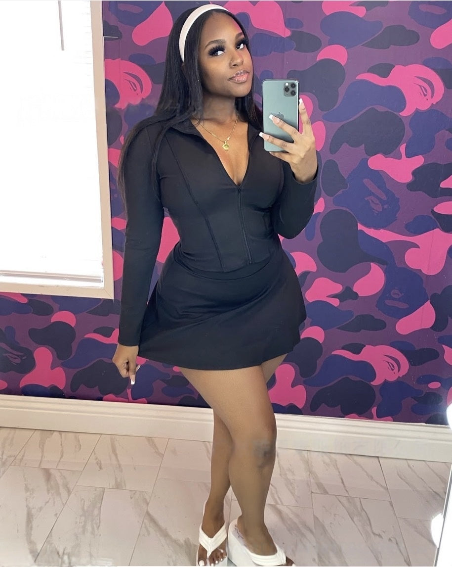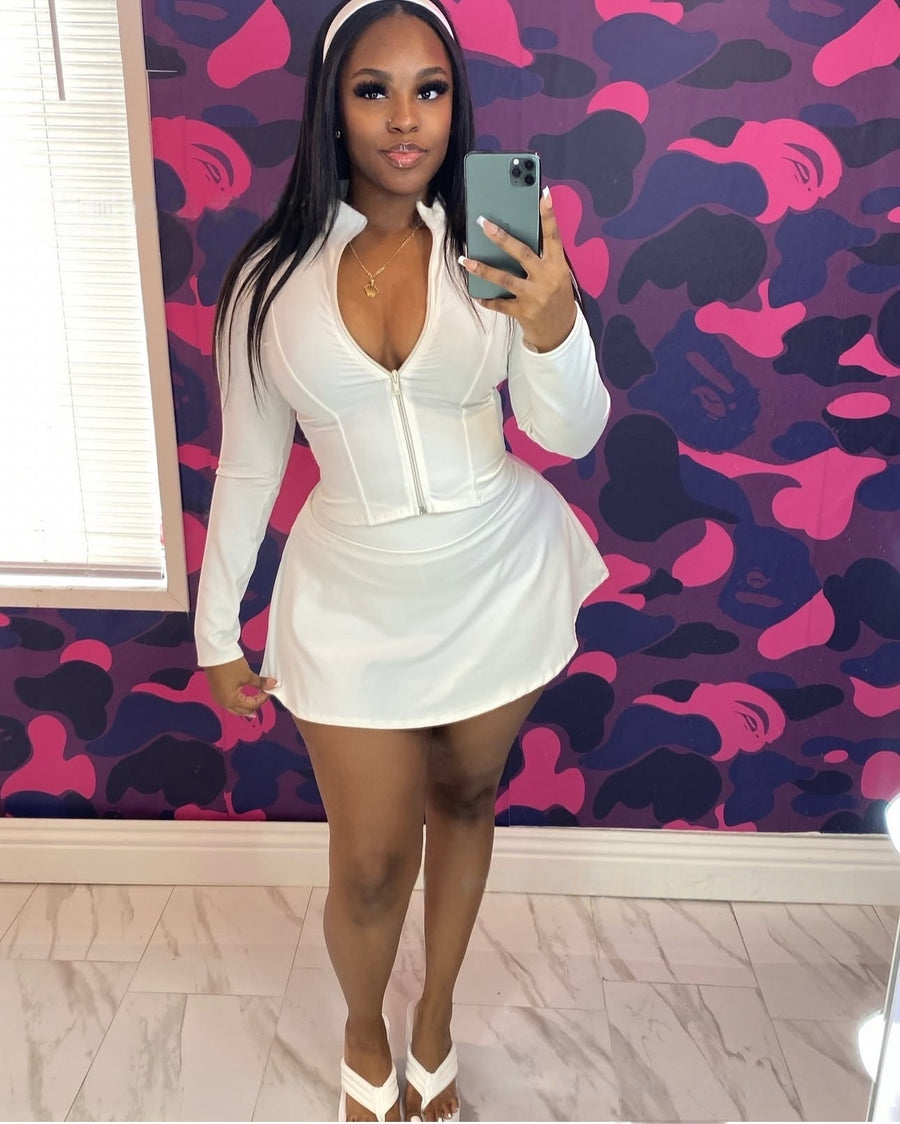 Sporty casual stand-up collar long-sleeved slim-fit zip-up cardigan top and shorts skirt 2PC set(CL12398))