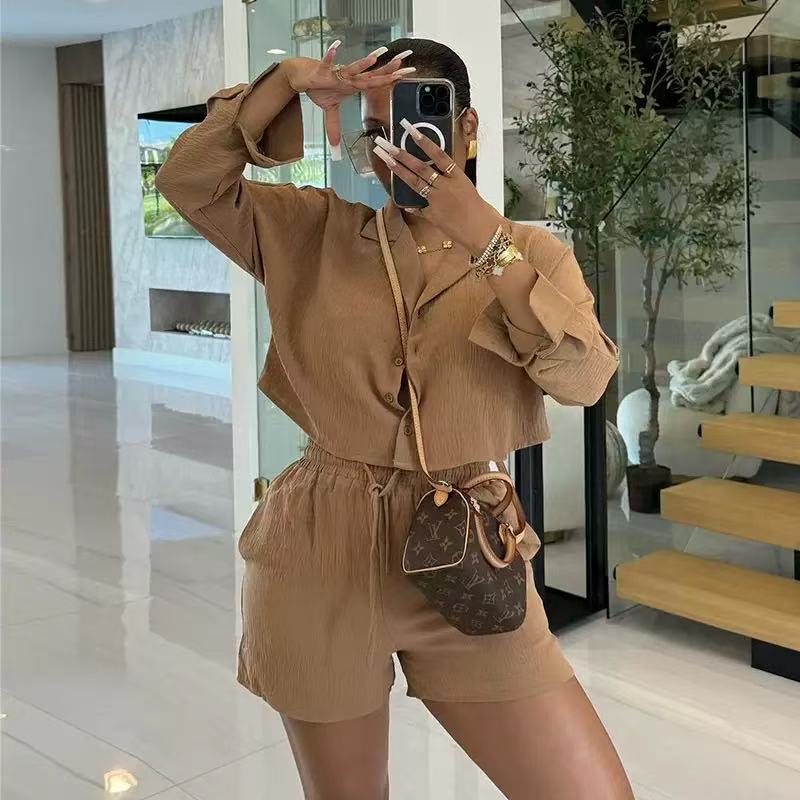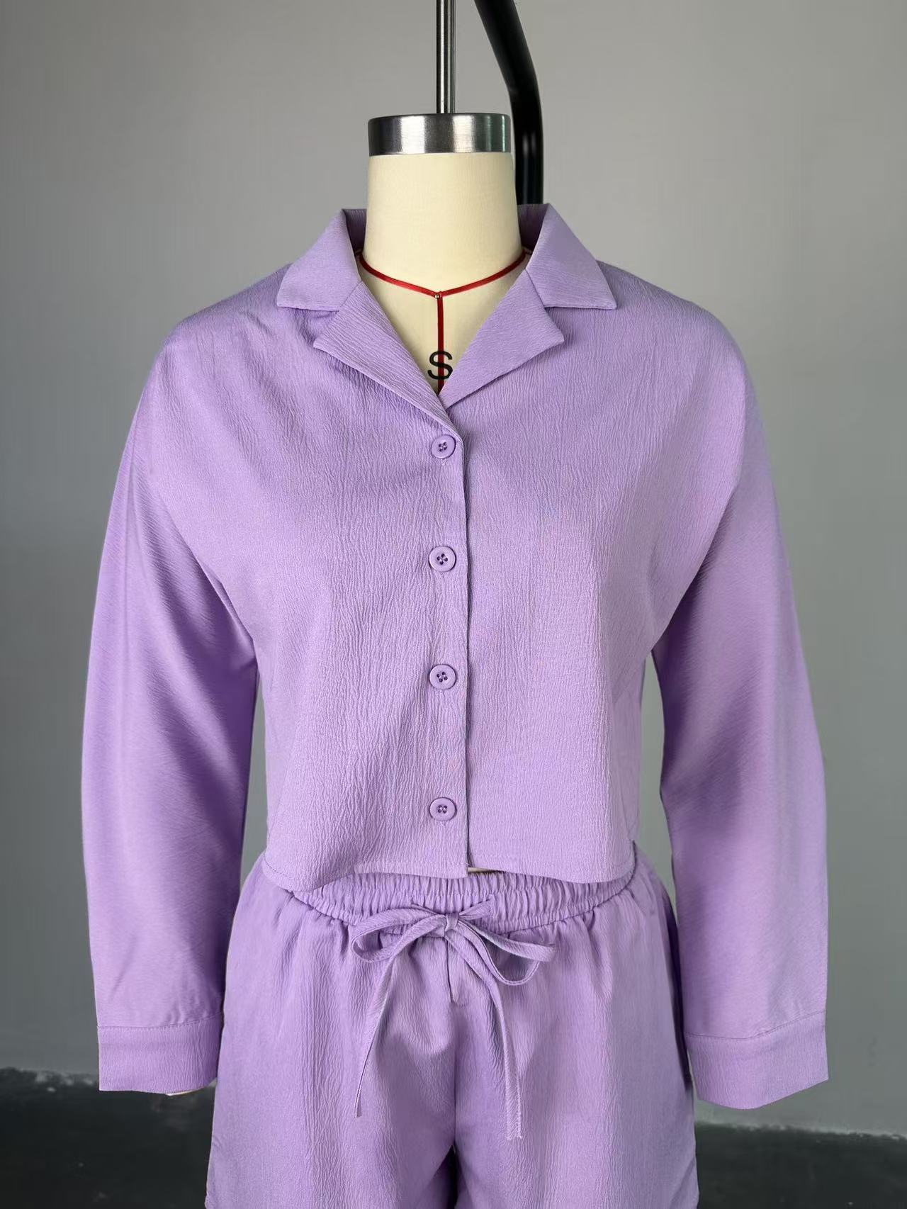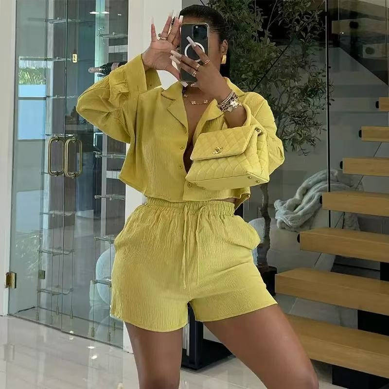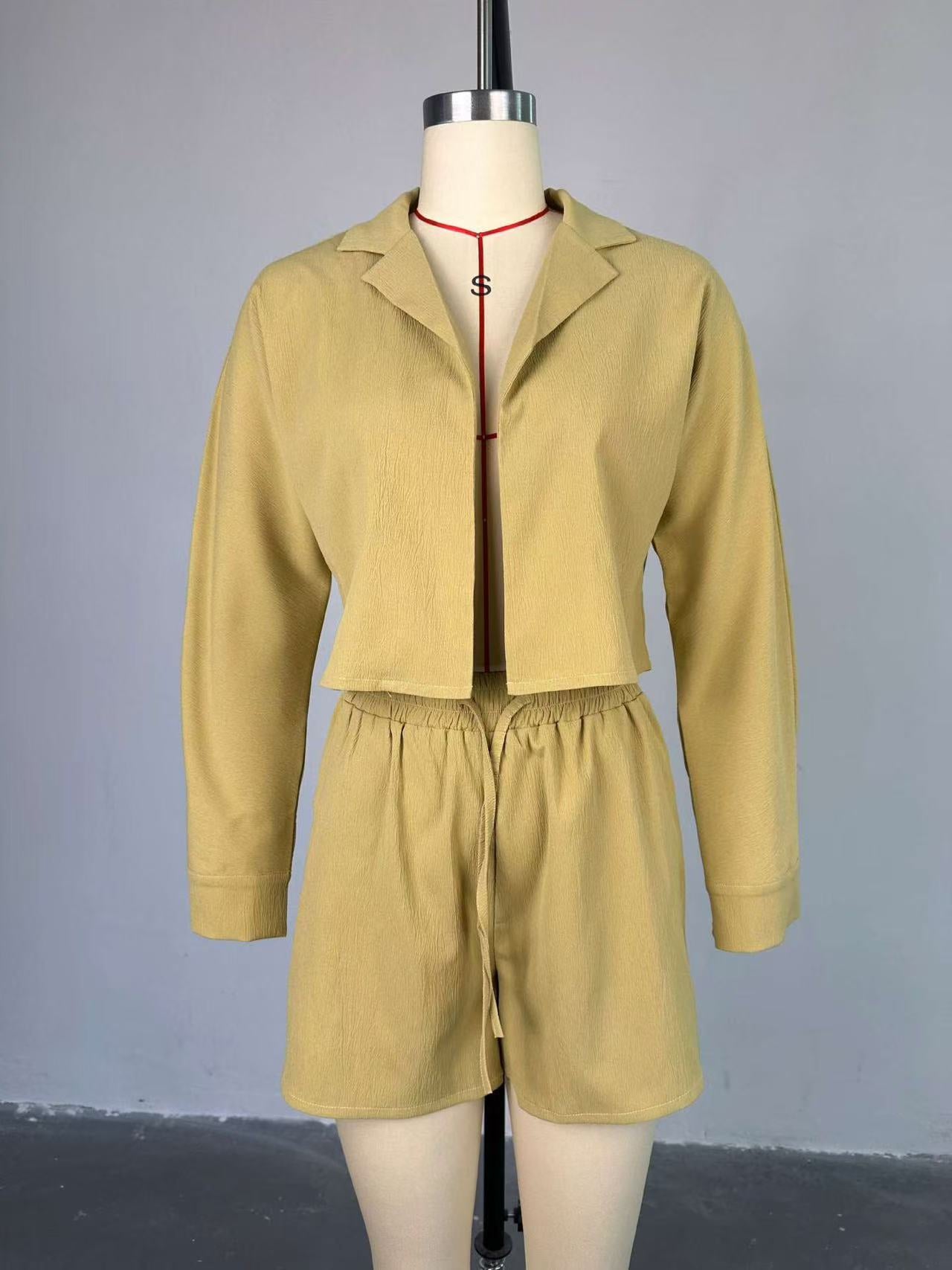 Suit collar long sleeve shirt high waist drawstring shorts casual 2pc set(CL12341)
