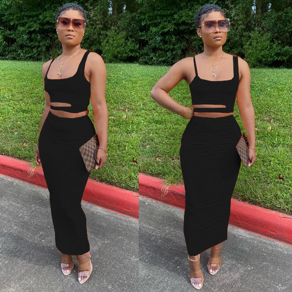 Solid Color Cutout Crop Top Casual Long Dress Suit 2pcs (OC10051)
