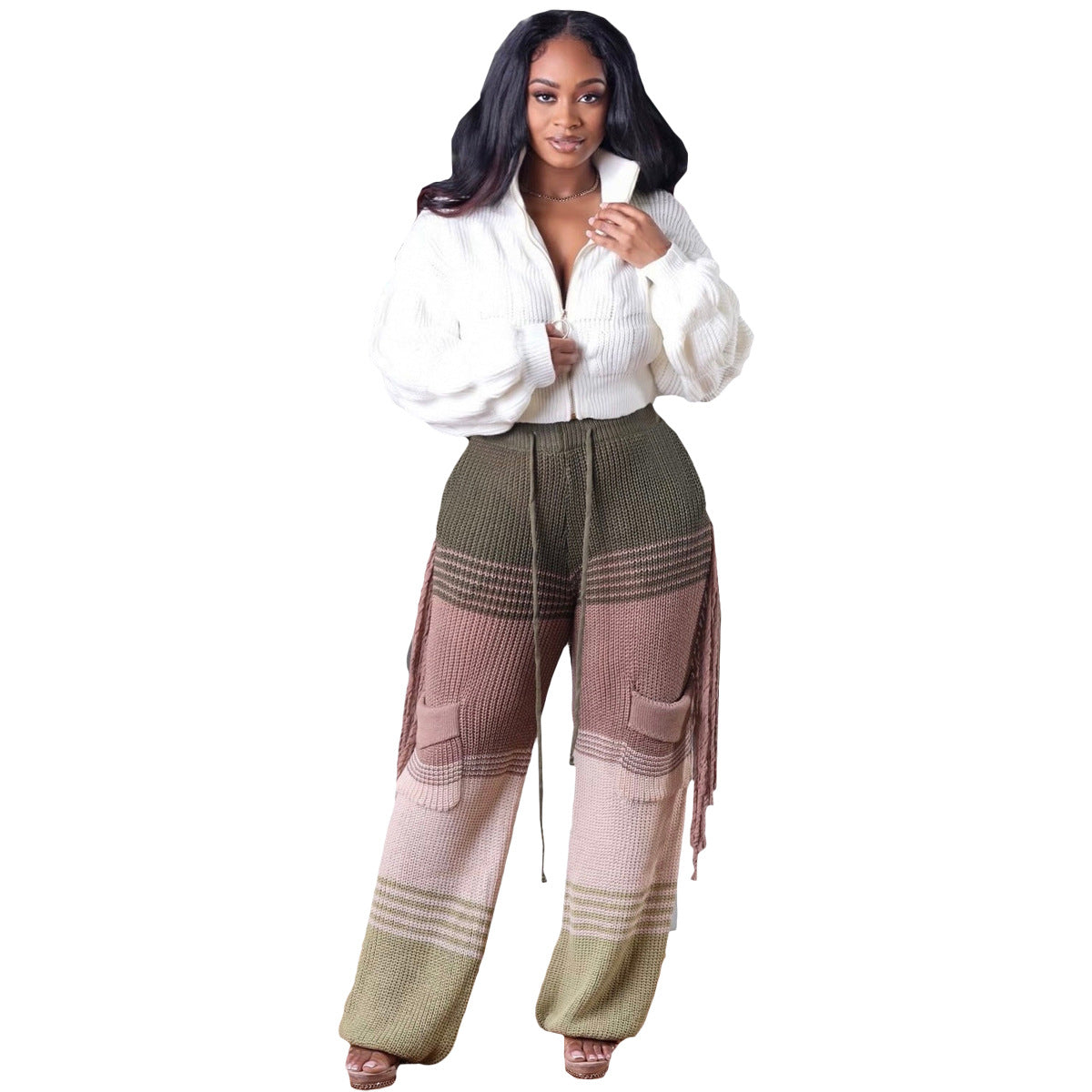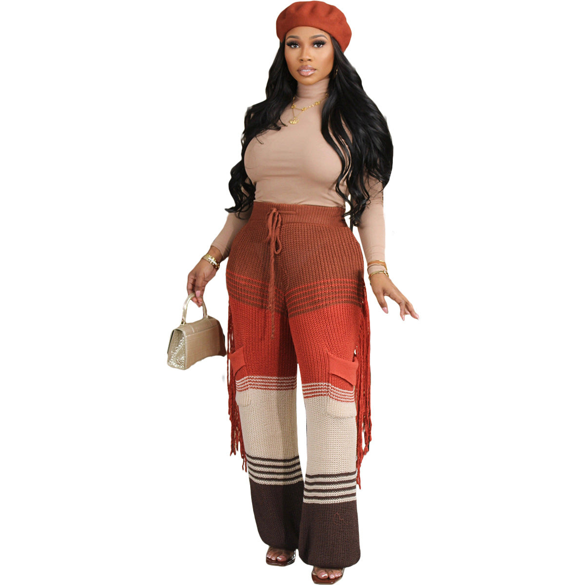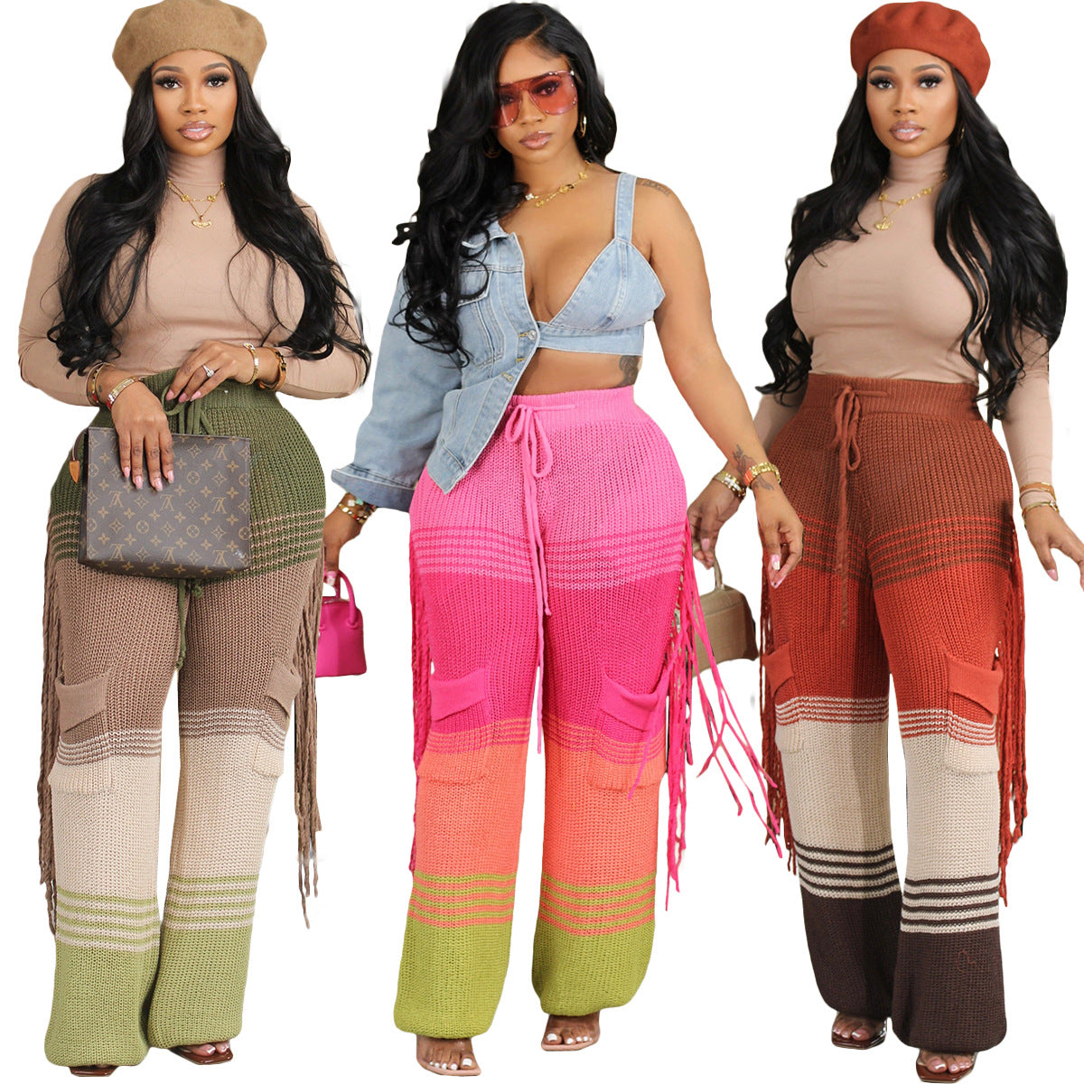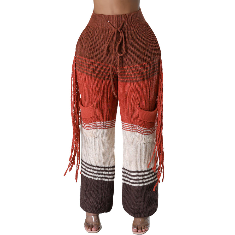 Casual knit colour-block hand-hooked tassels for loose straight-leg pants(CL12011)
