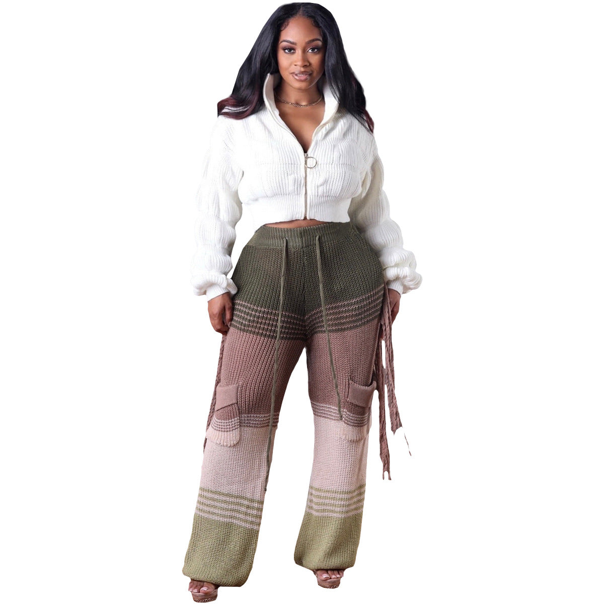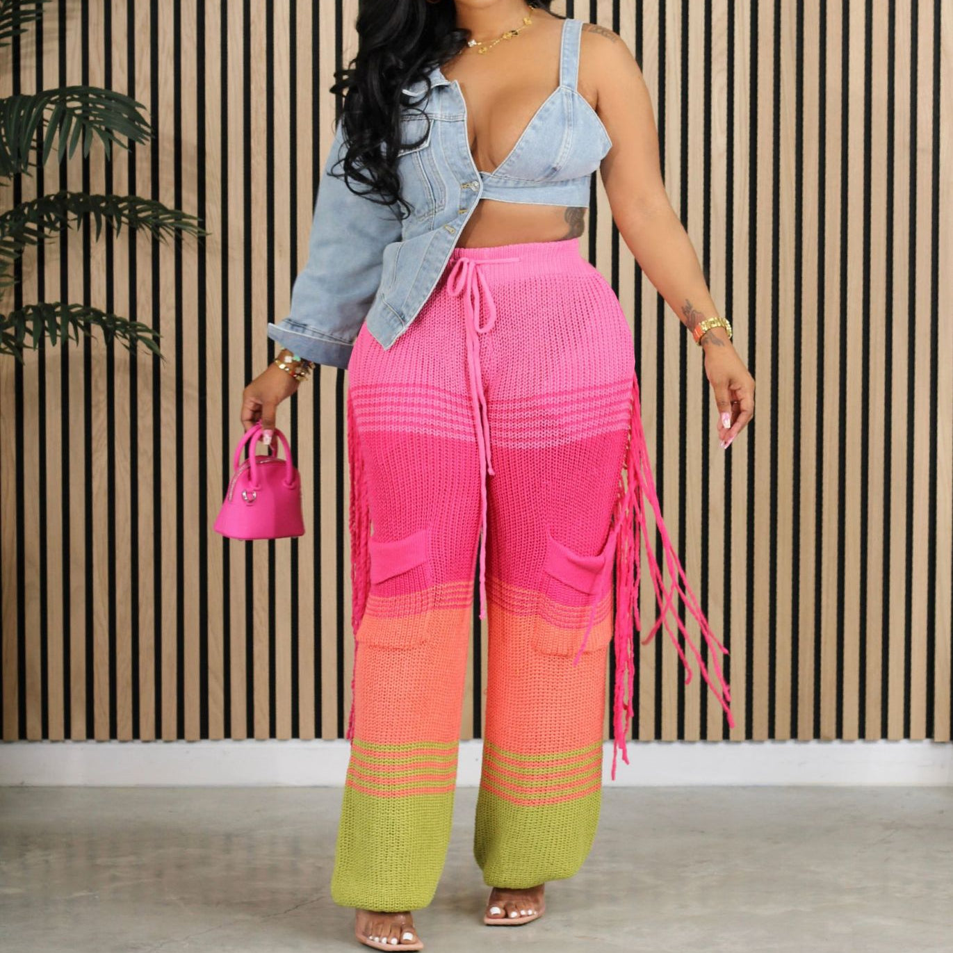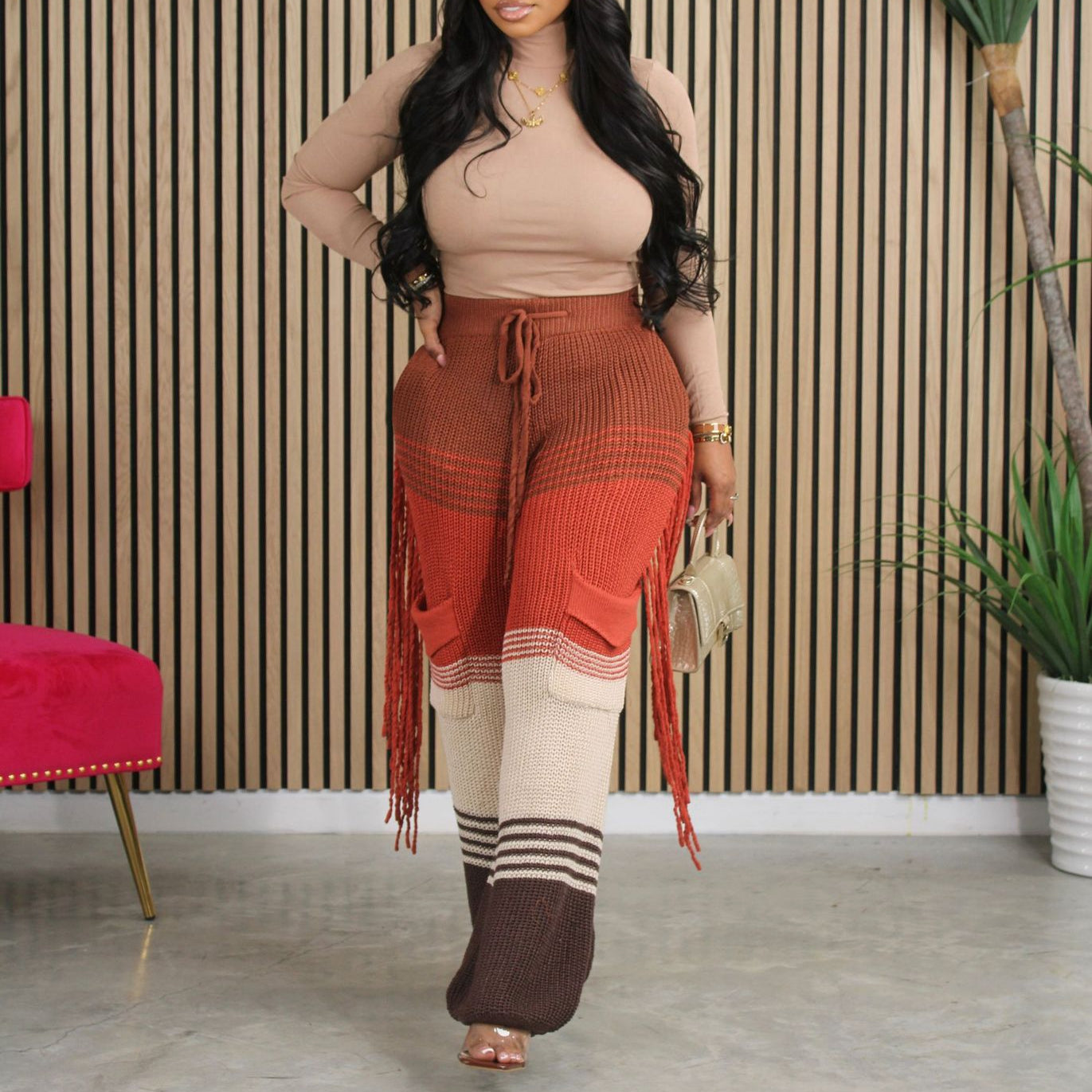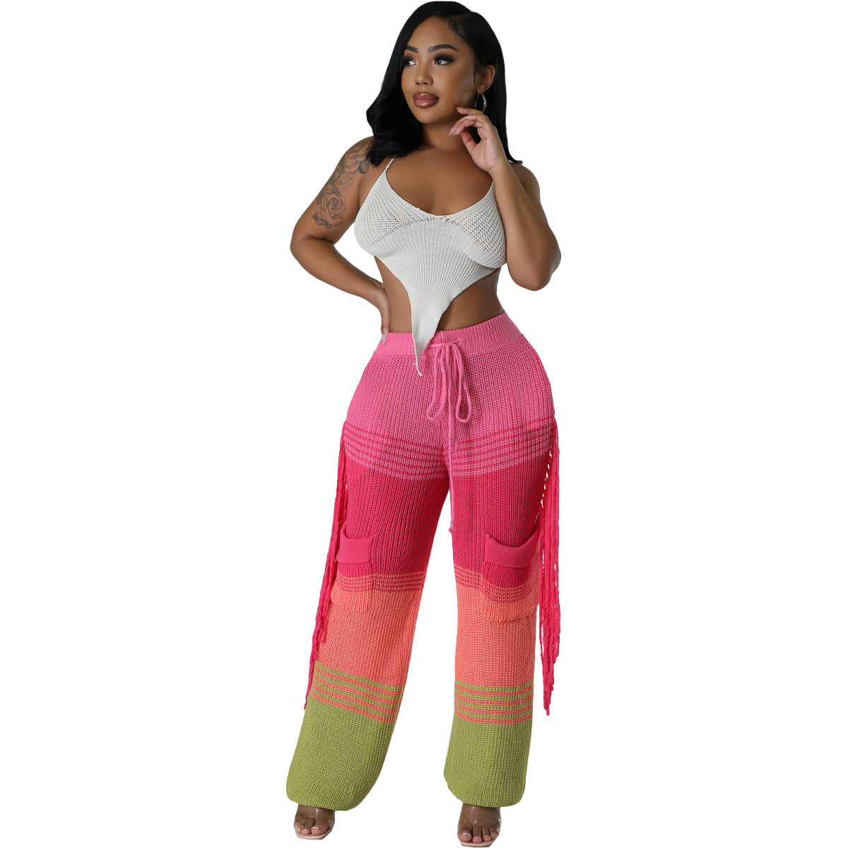 Casual knit colour-block hand-hooked tassels for loose straight-leg pants(CL12011)