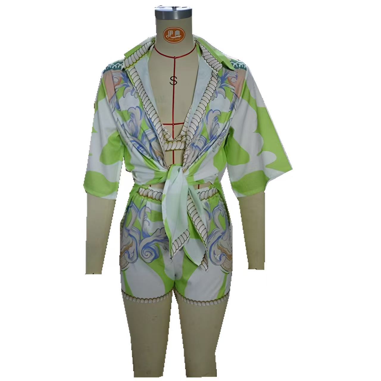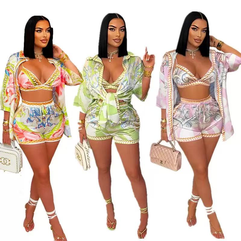 Casual printed chest-wrapped shirt and shorts 3pc set(CL12360)