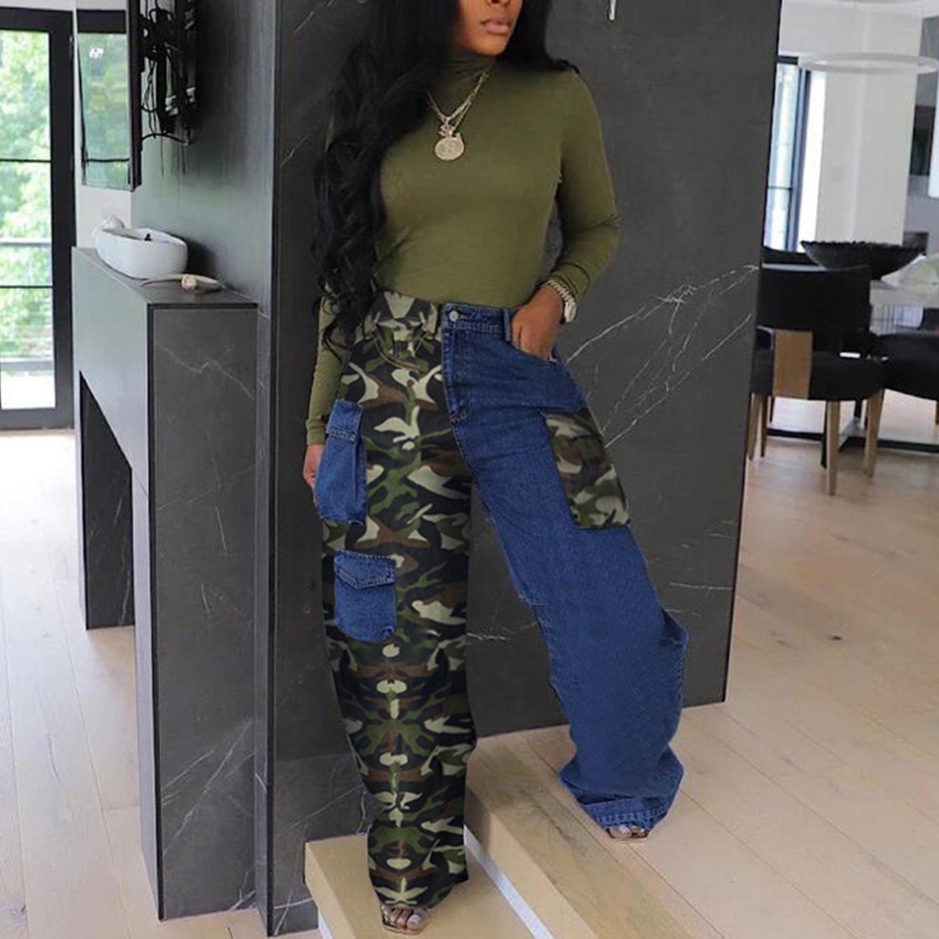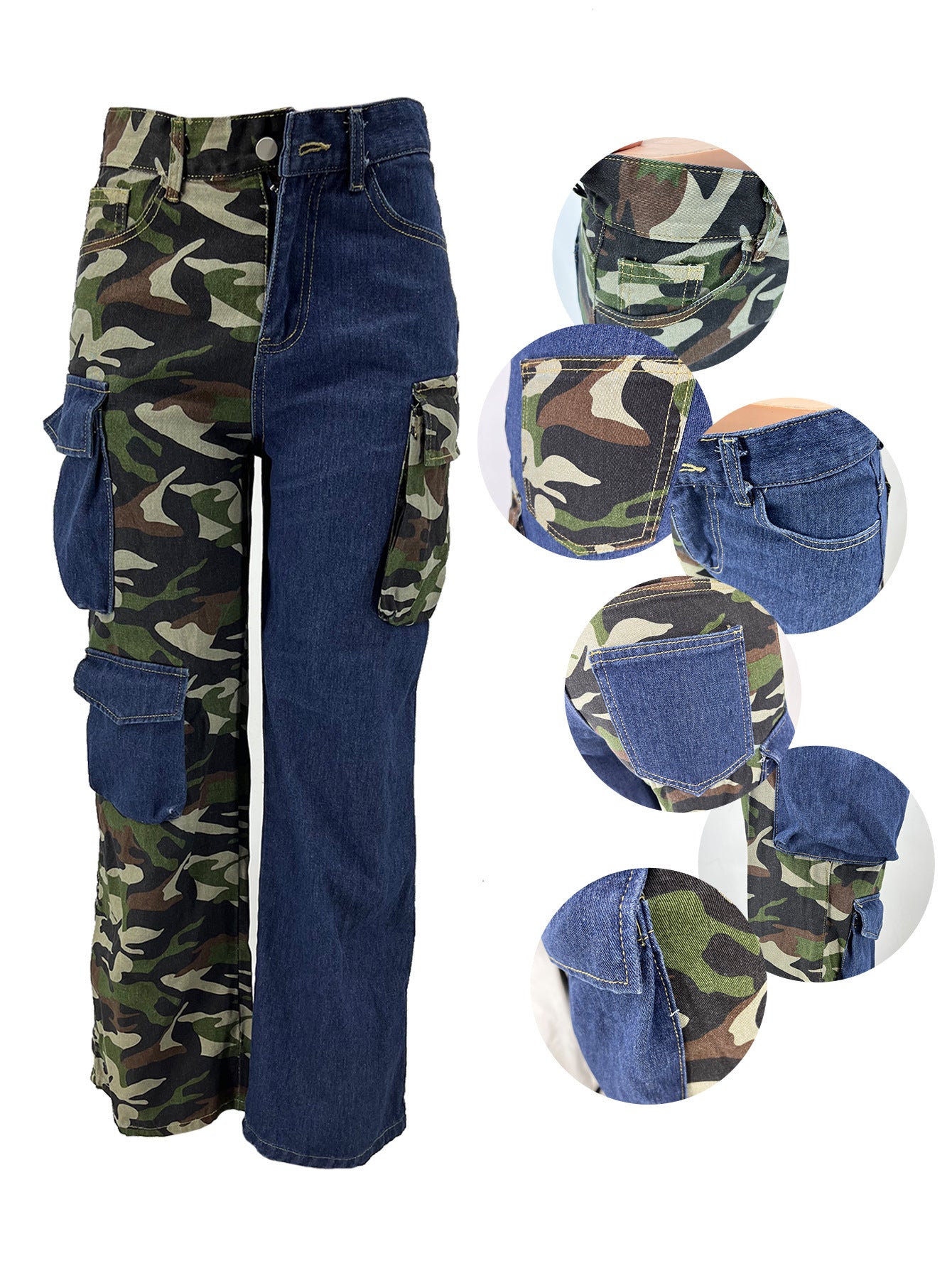 Denim patchwork camouflage three-dimensional pocket overalls(CL12048)