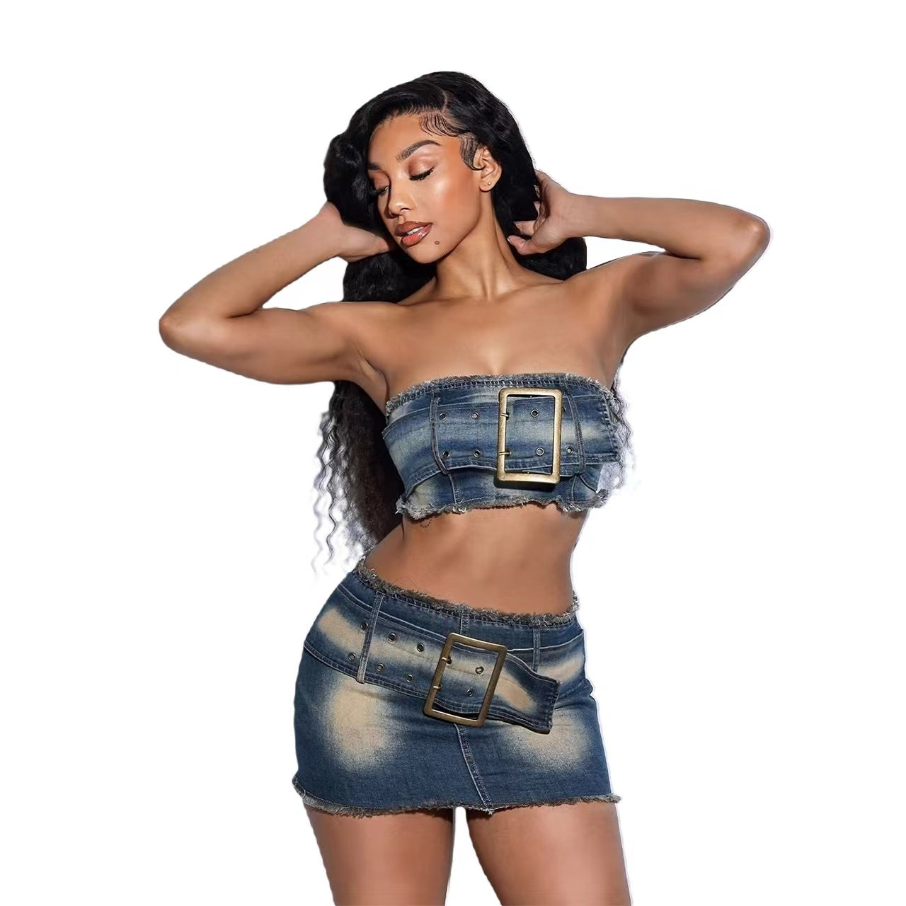 Denim tube top belt skirt 2pc set(CL12174)