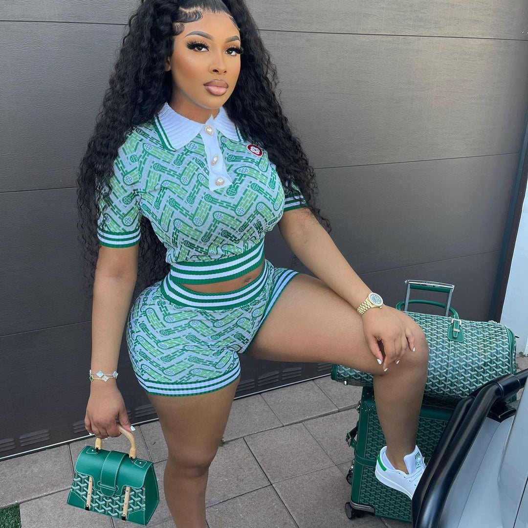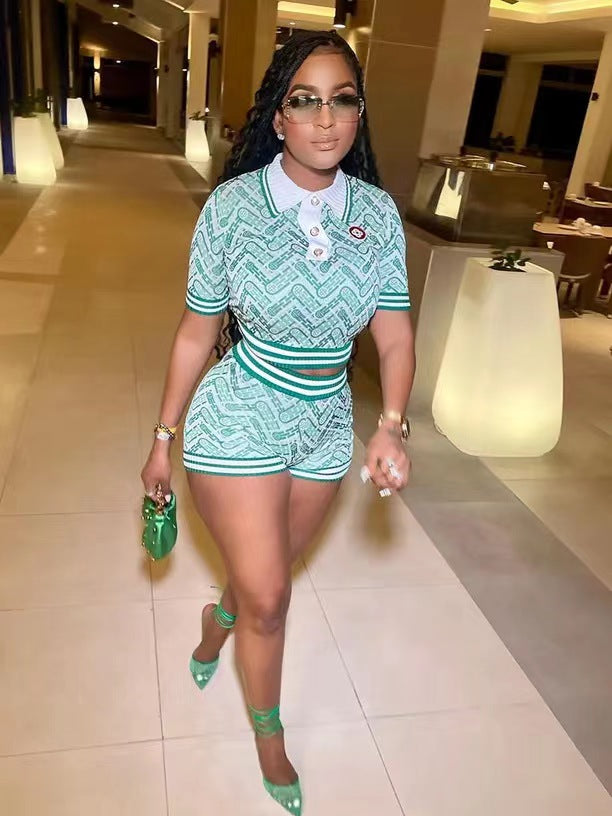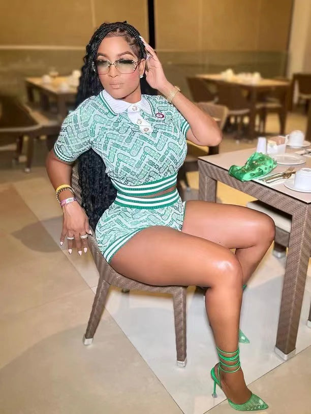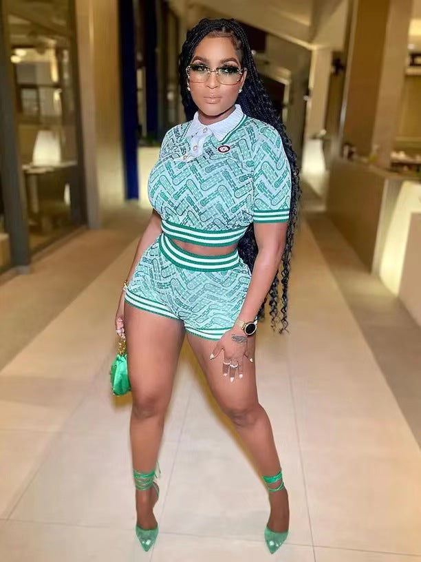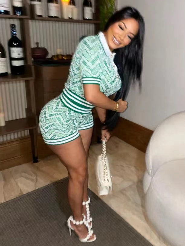 Digital Printing Abstract Rib Stitching Short Sleeve Shorts Suit(CL11642)