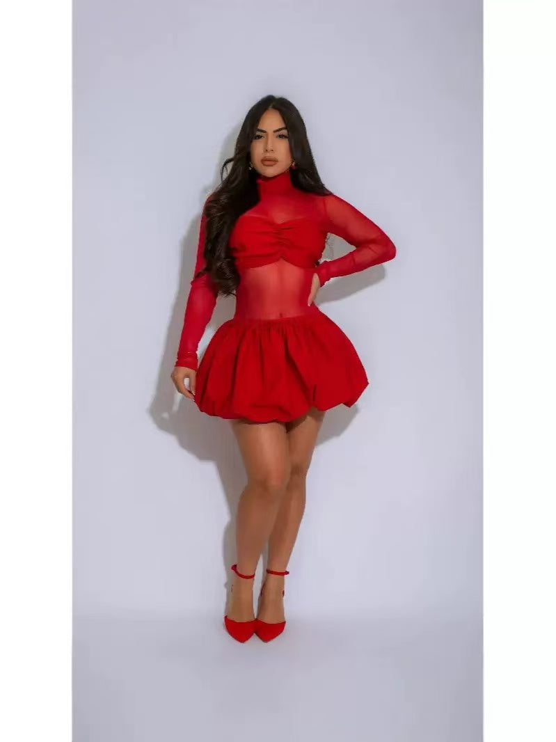 Elegant slim bubble skirt long sleeve gauze dress(CL12334)