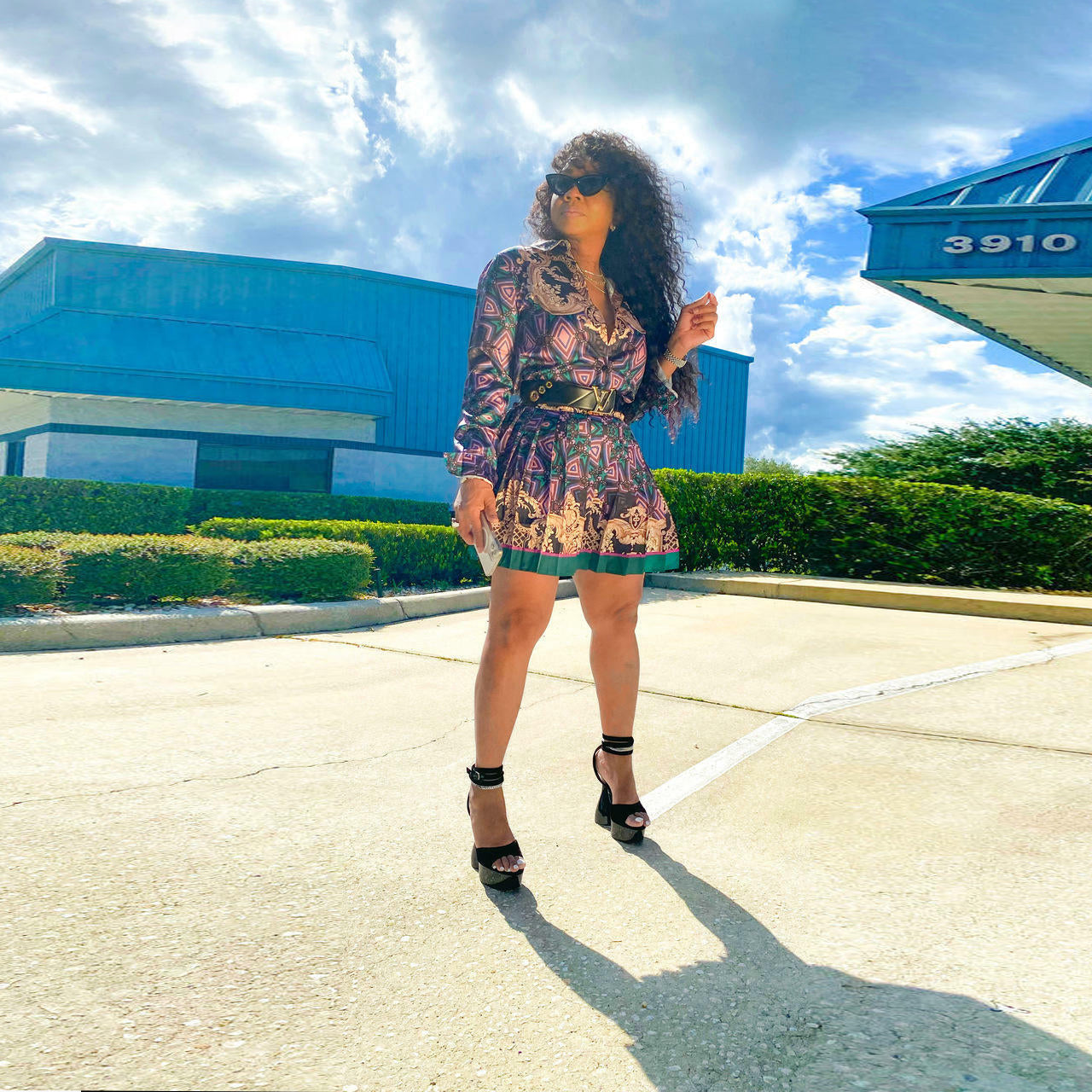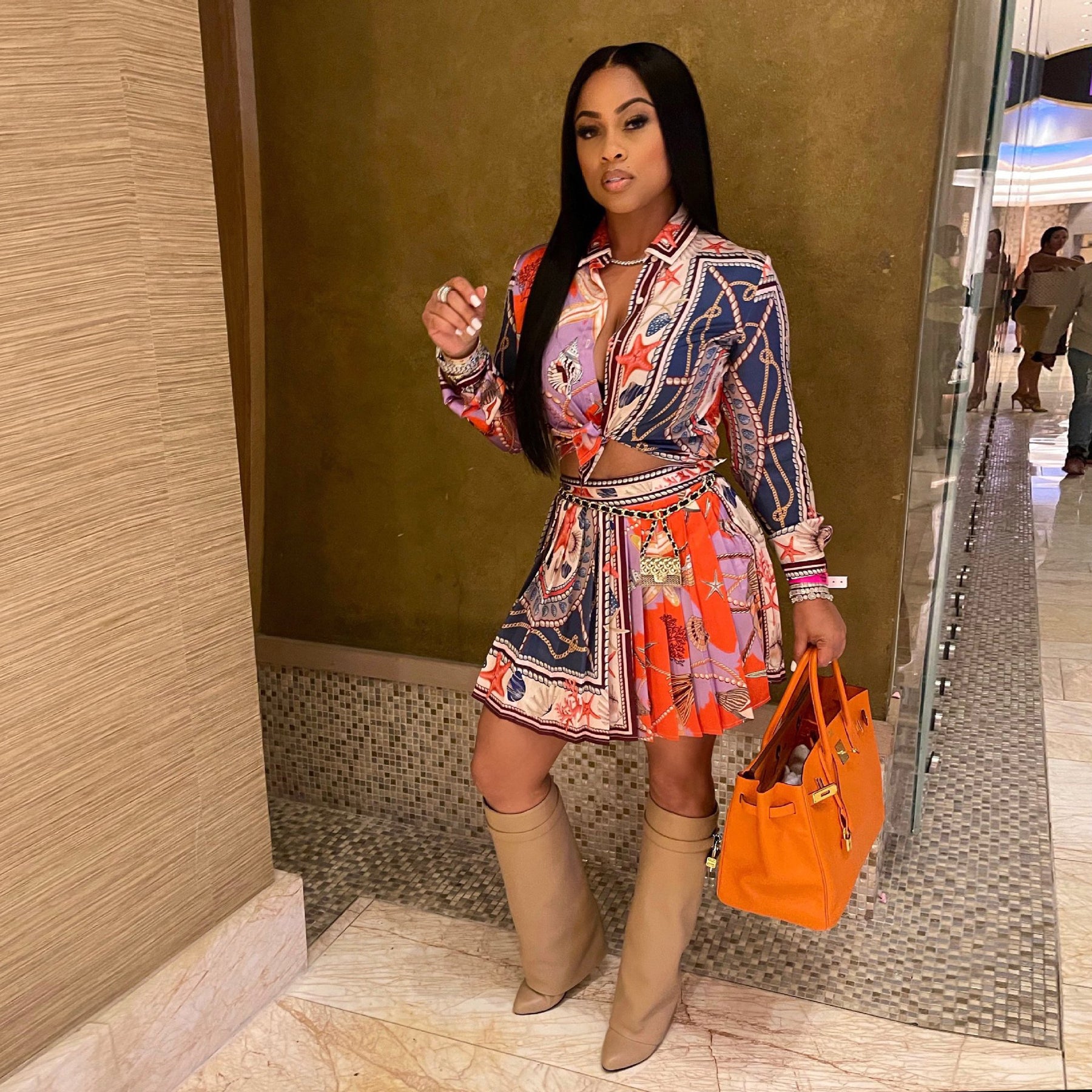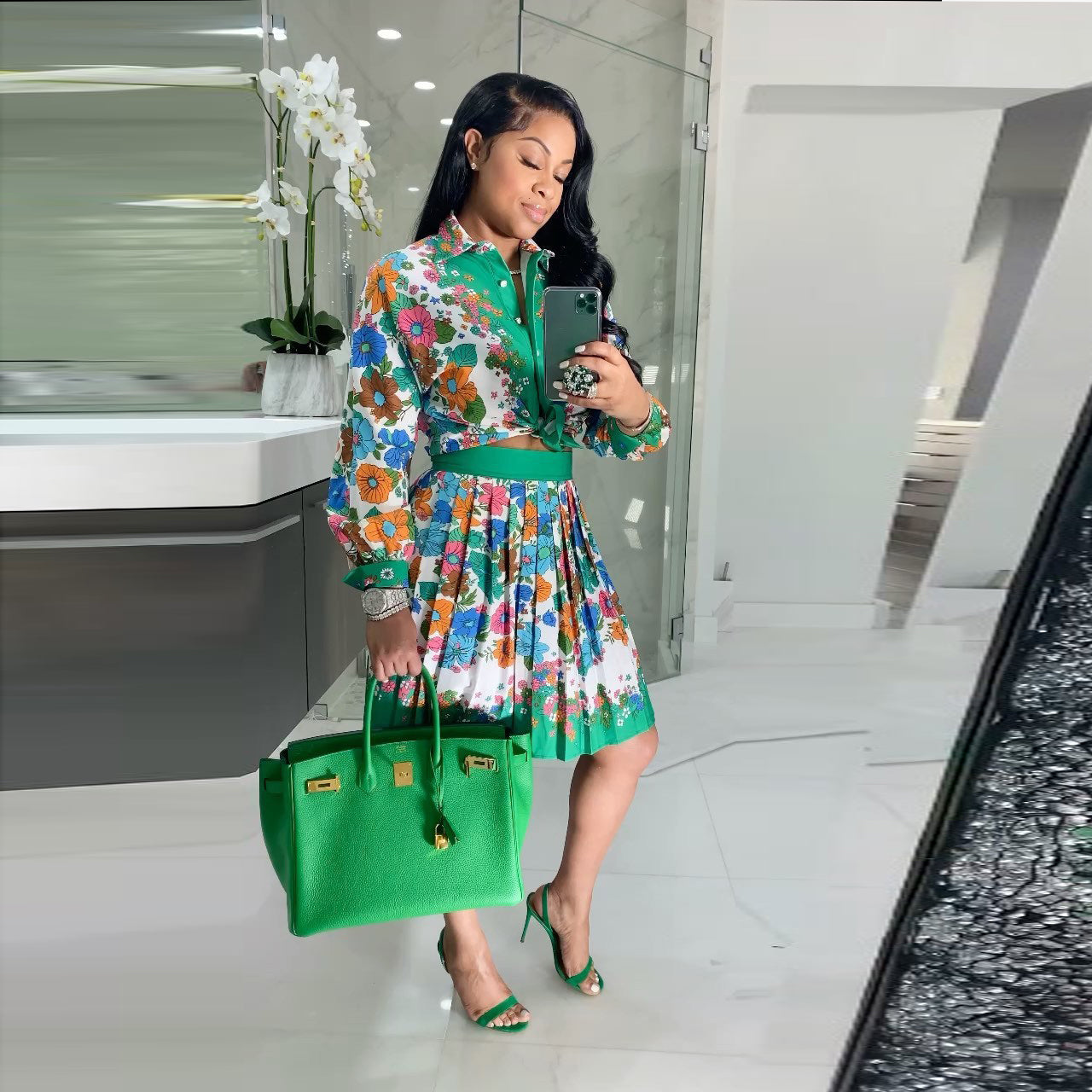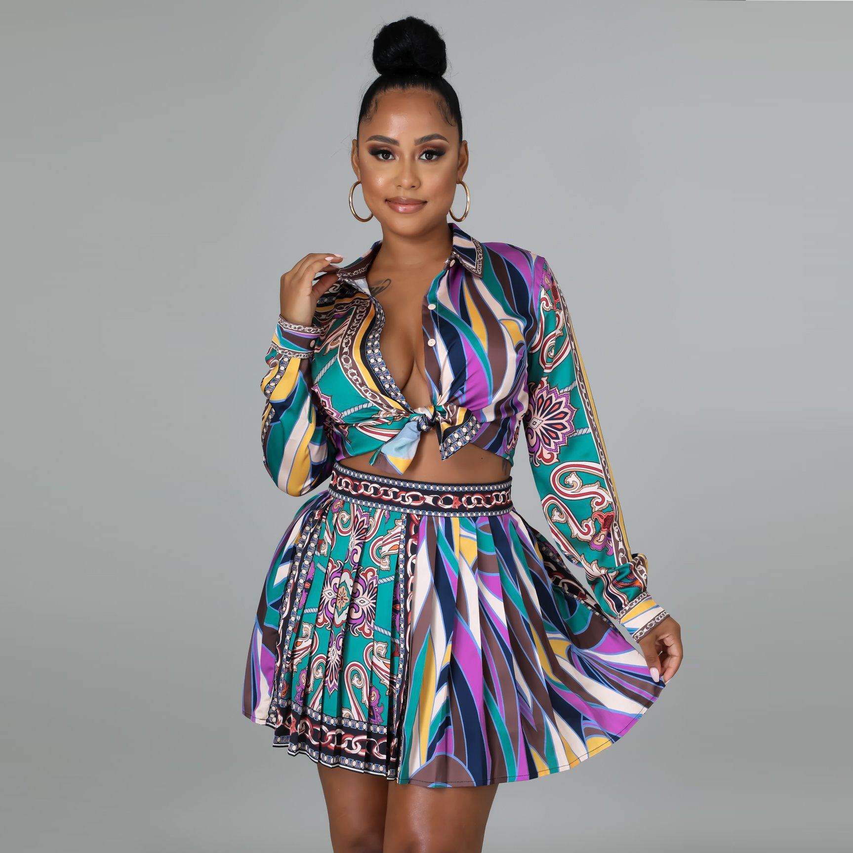 Fashion Printed Cardigan Pleated Skirt Suit 2PC(CL10020)