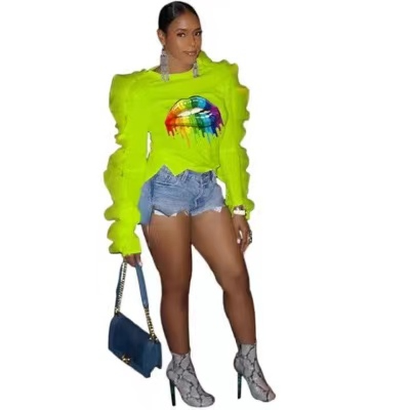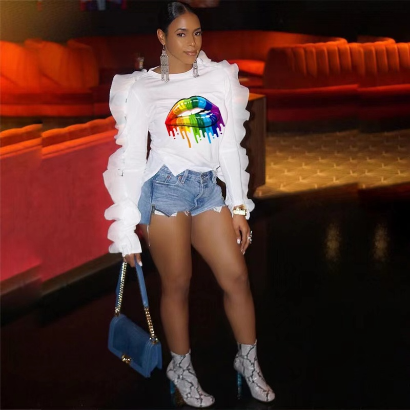 Free shippng fashion women's bubble sleeve top with rainbow color lip print(FC9605)