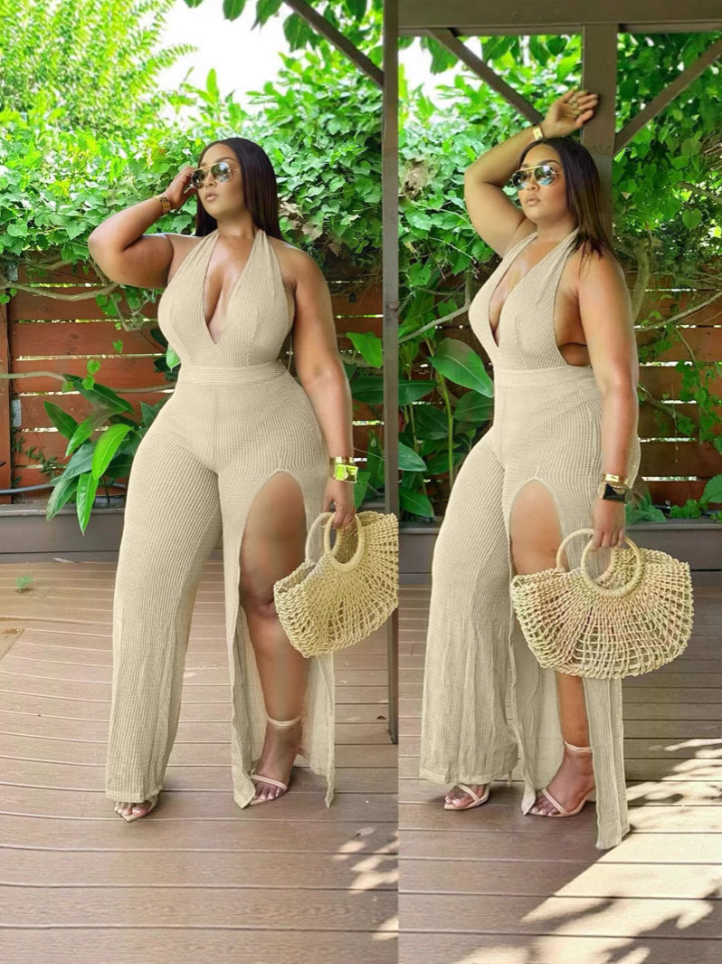 Halterneck irregular slit jumpsuit trousers(CL12369)