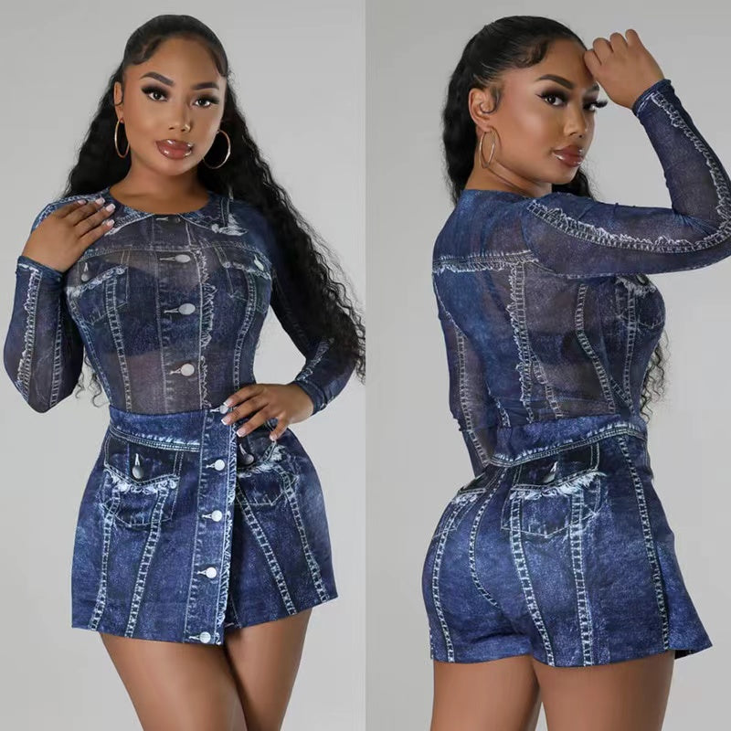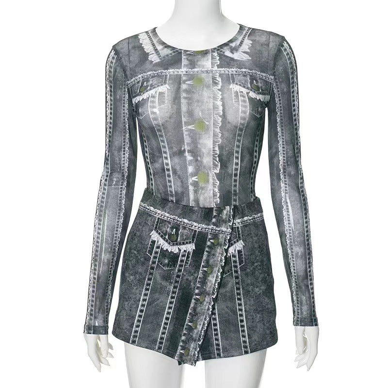 Imitation denim printed gauze jumpsuit skirt 2pc set (CL12111)