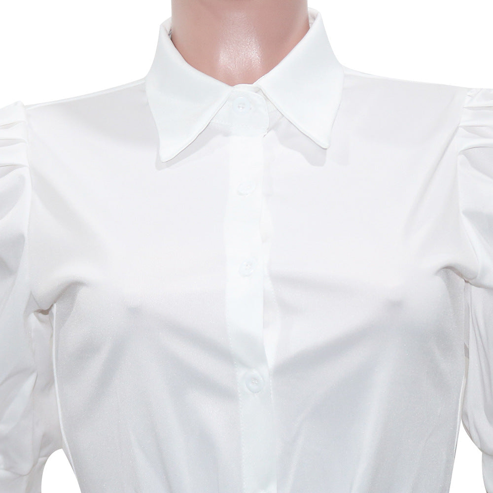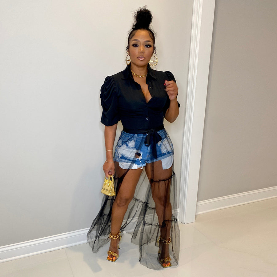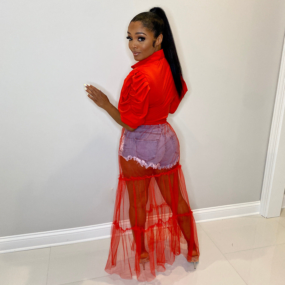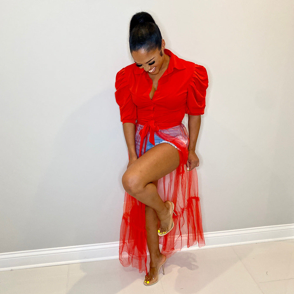 Lapel Short Sleeve Lace-up Shirt Mesh Stitching Dress(CL10817)
