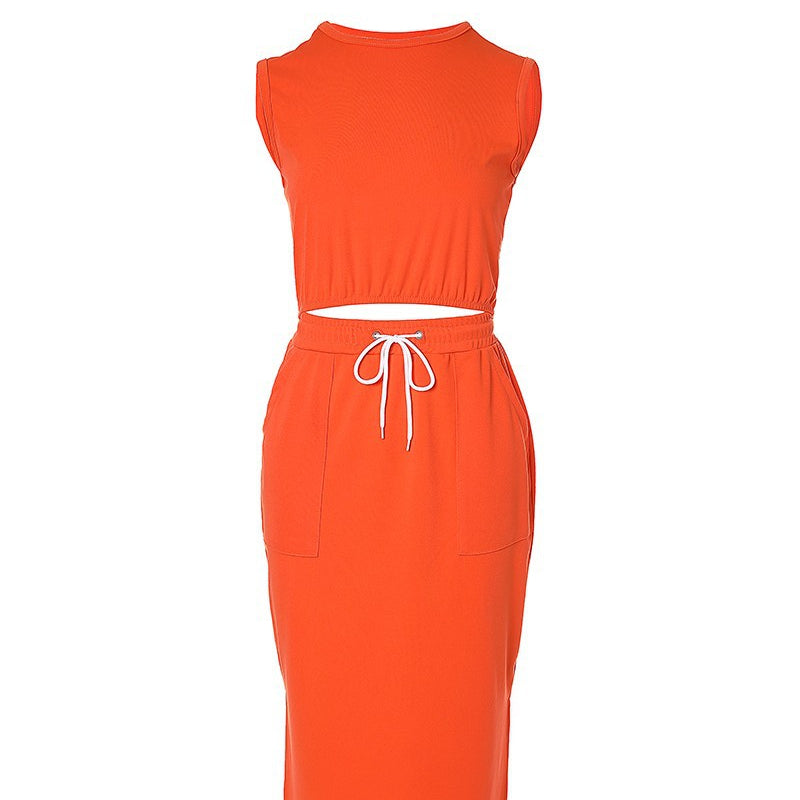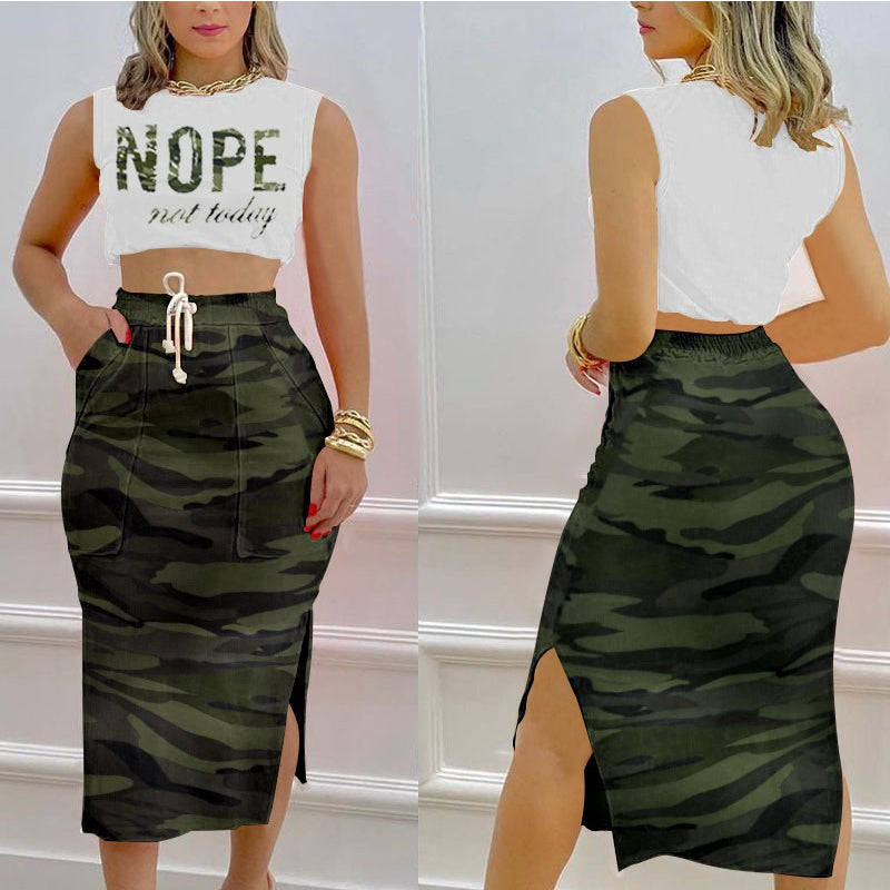 Letter Print Vest and Drawstring Dress with Vents 2PC(CL10079)