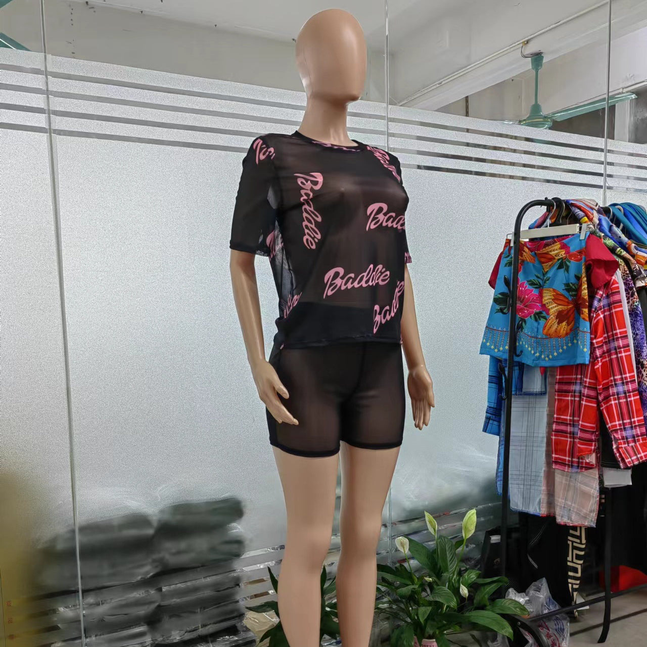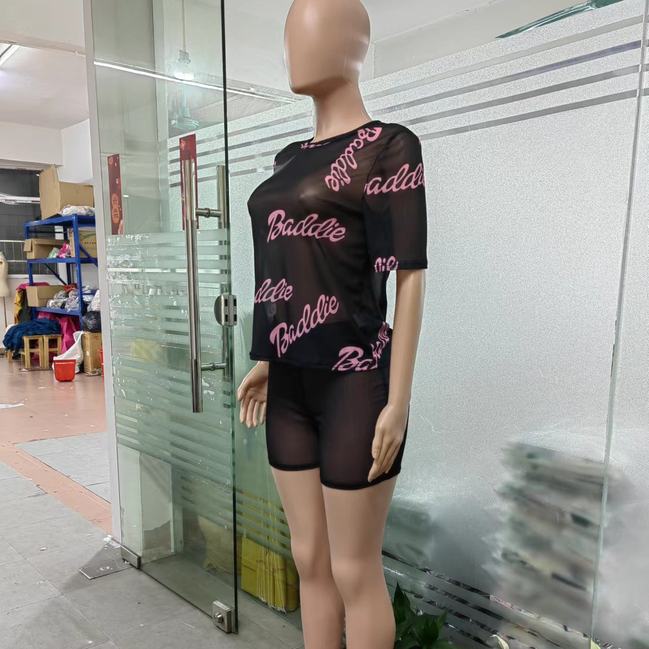 Letter Printing See-through Short-Sleeved Shorts Two-Piece Set (CL10183)