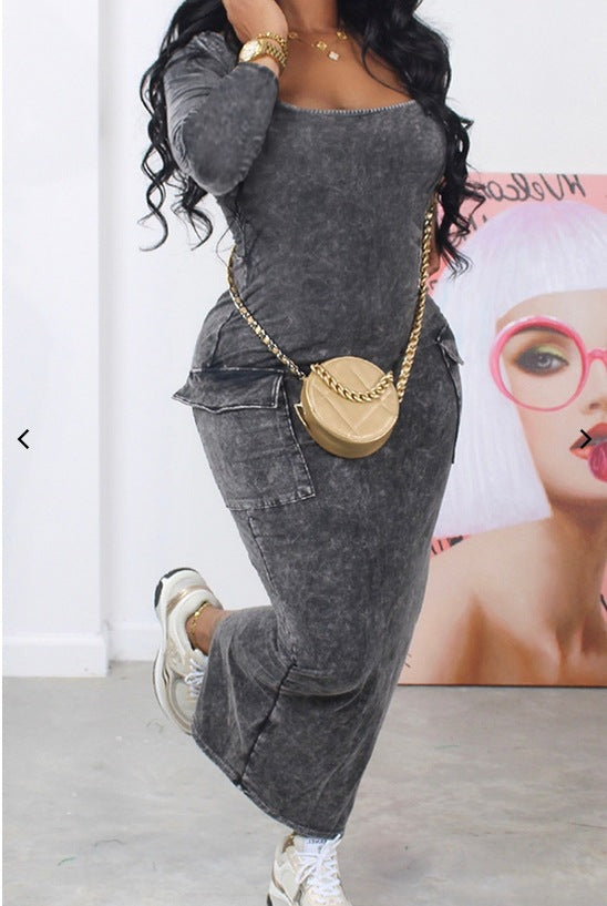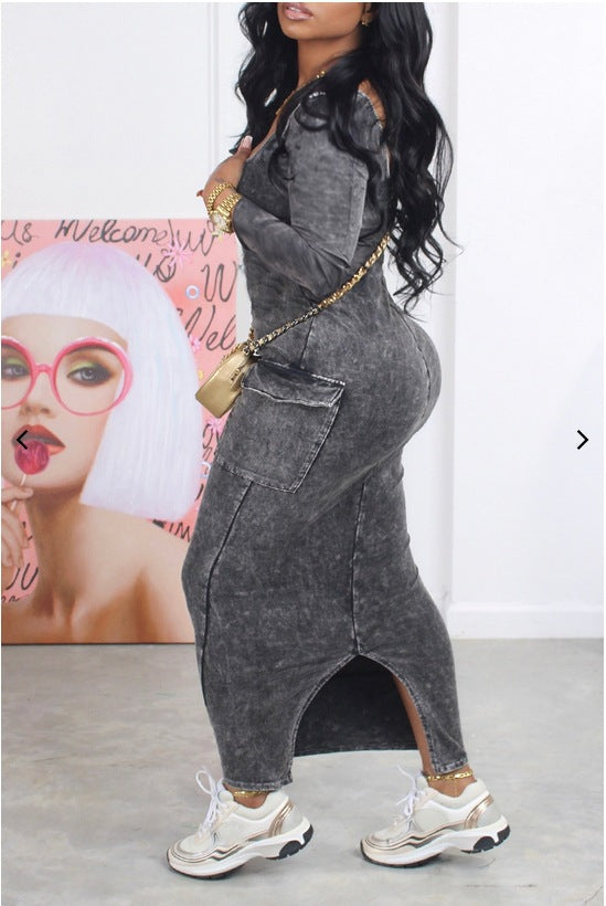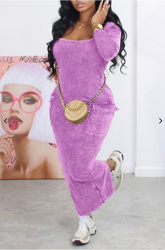 Long sleeved printed large pocket back slit wrap buttocks dress(CL12053)