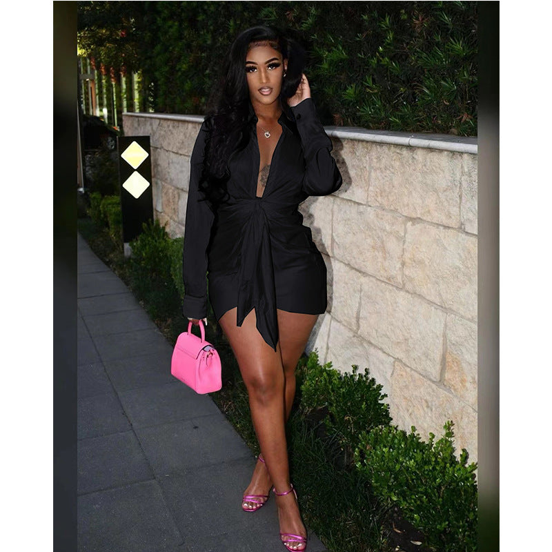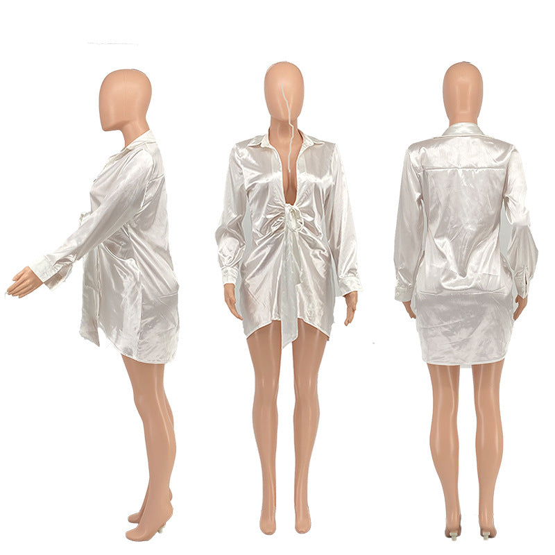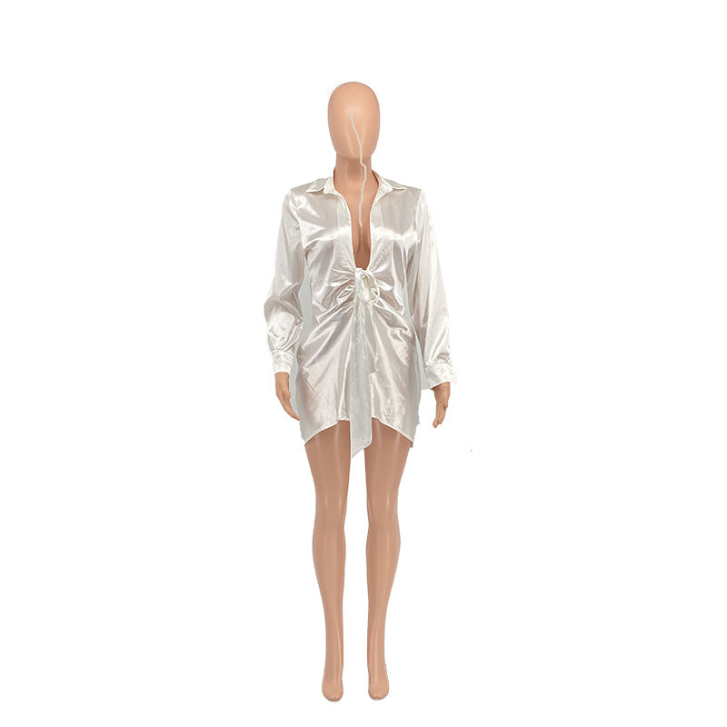 Long Sleeved Strapping Inch Bag Buttocks Skirt Lapel Cardigan Medium Length Shirt (CL11850)