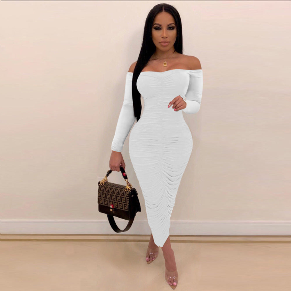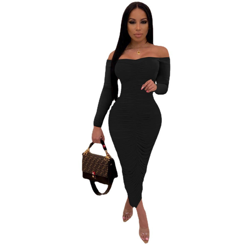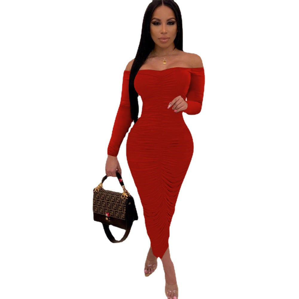 New Sexy Solid Color Pleated Long Sleeve Narrow Dress(CL9997)