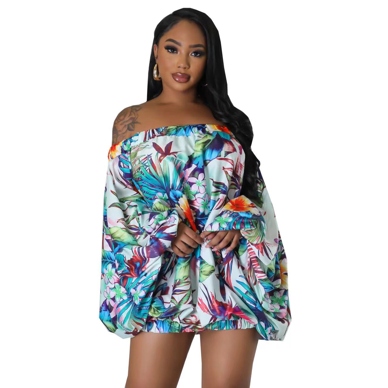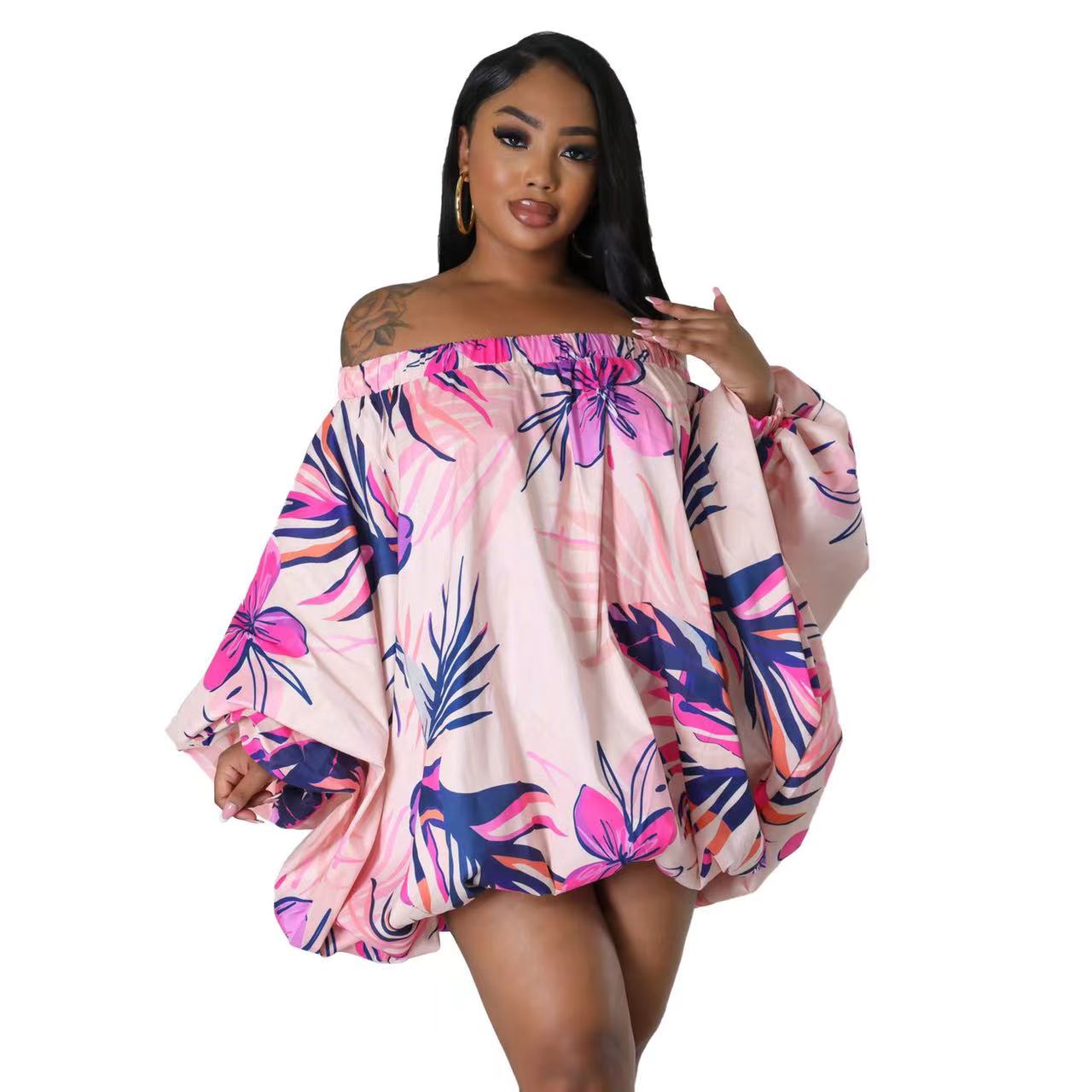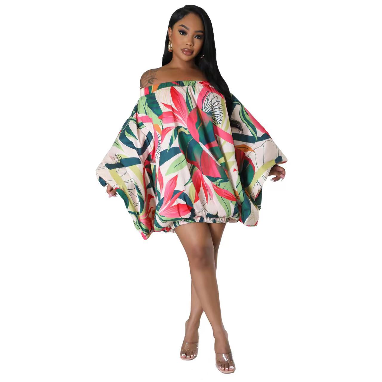 Off-the-shoulder loose printed bat sleeve skirt(CL12117)
