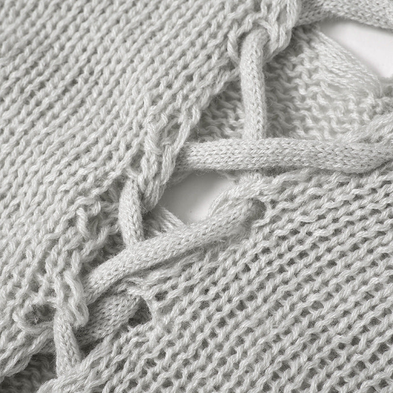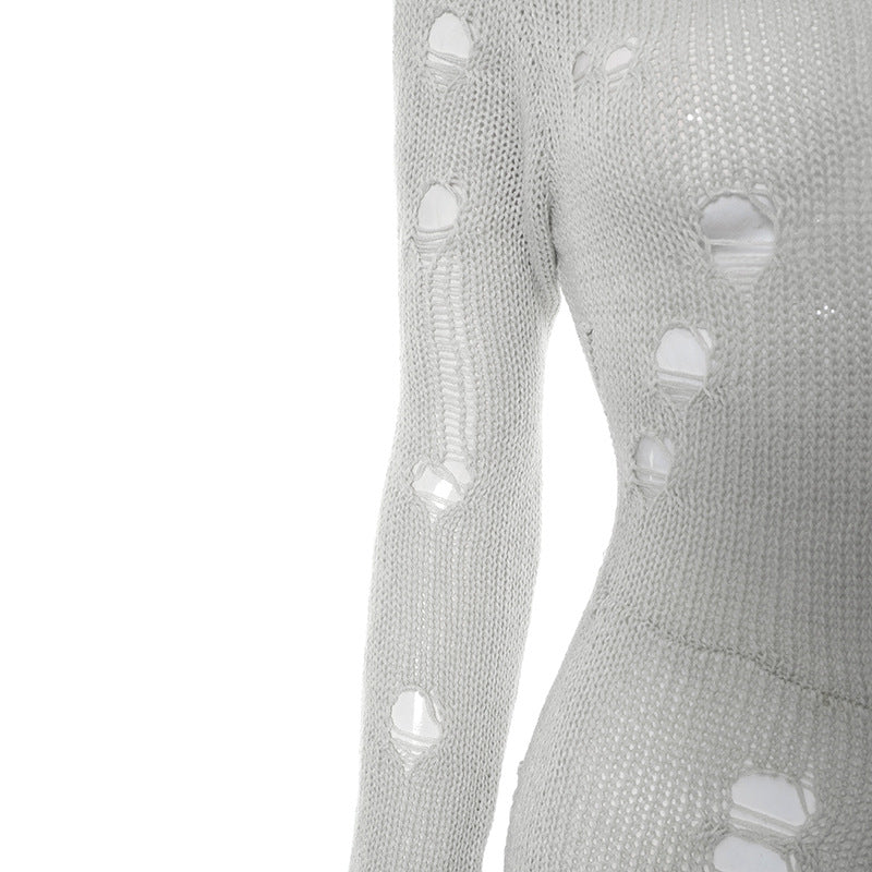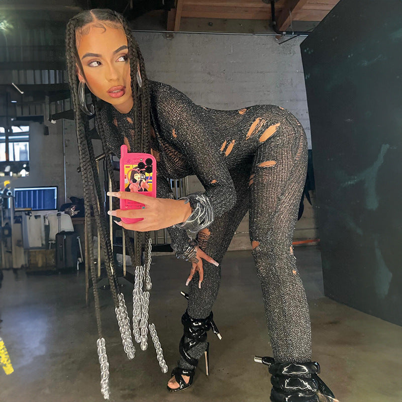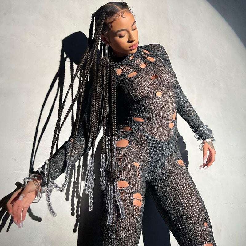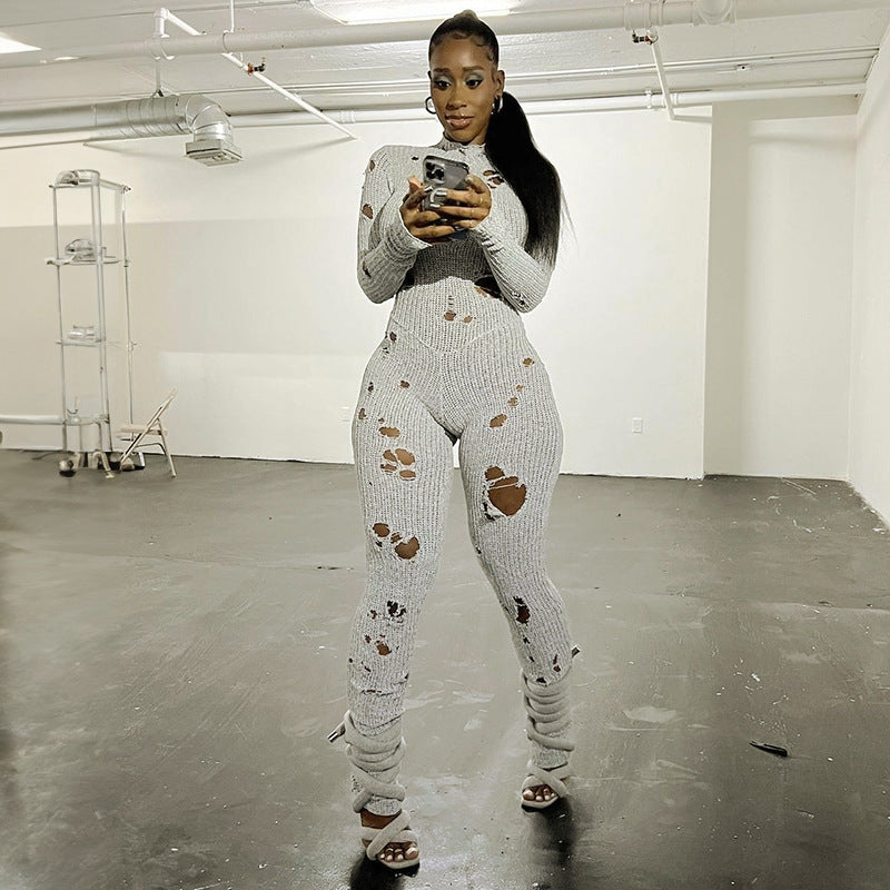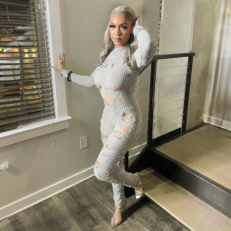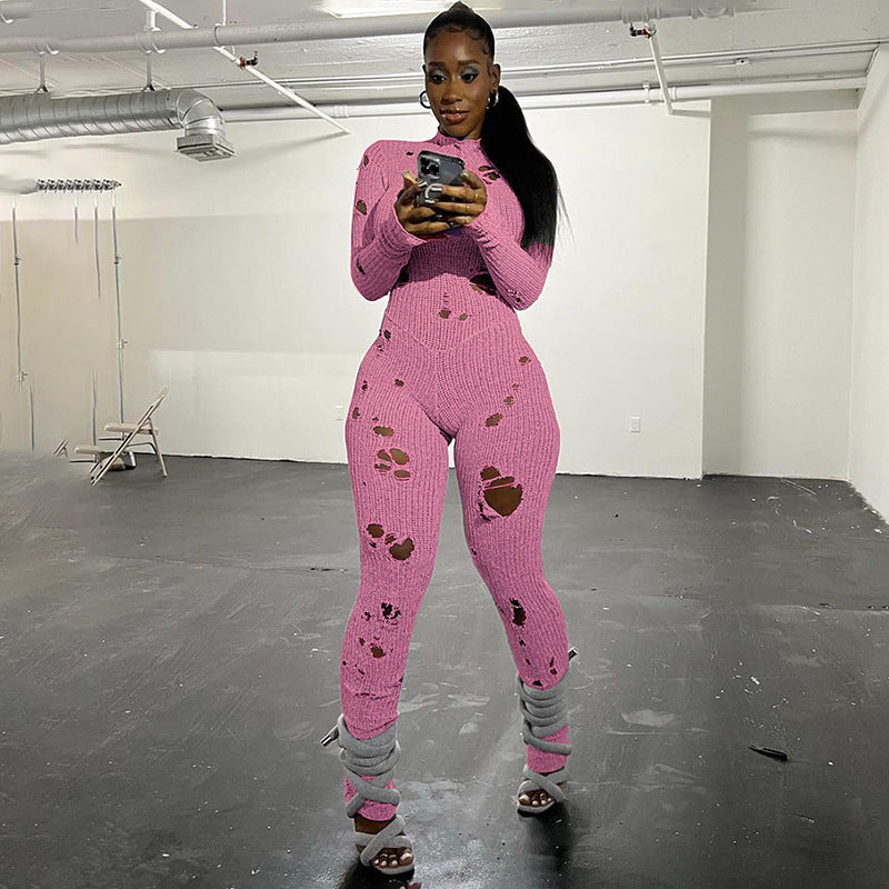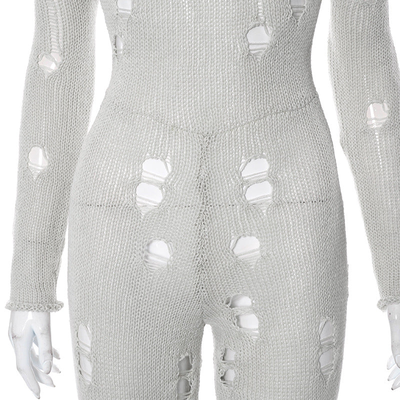 Perforated Long Sleeve Back Strap Woolen Long jumpsuit(CL12025)
