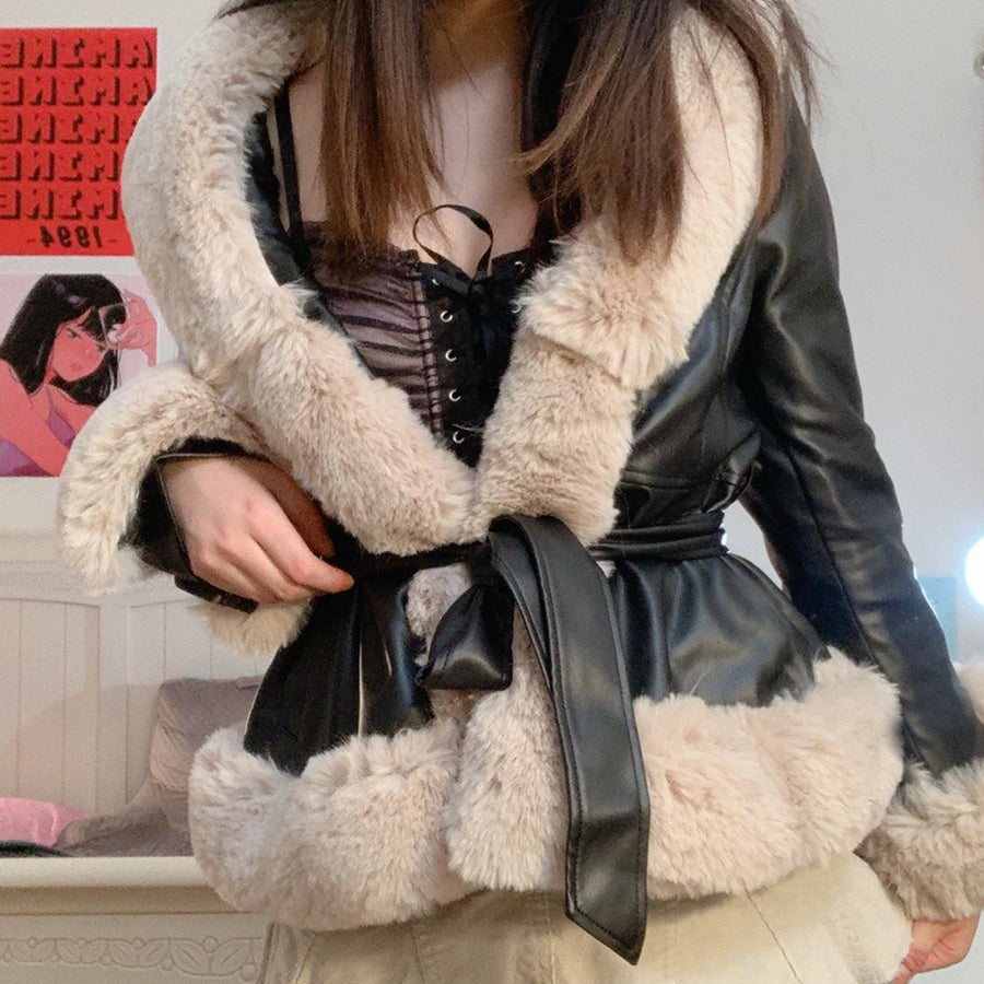 PU leather ladies' leather coat with large fur collar and waist (CL11992)