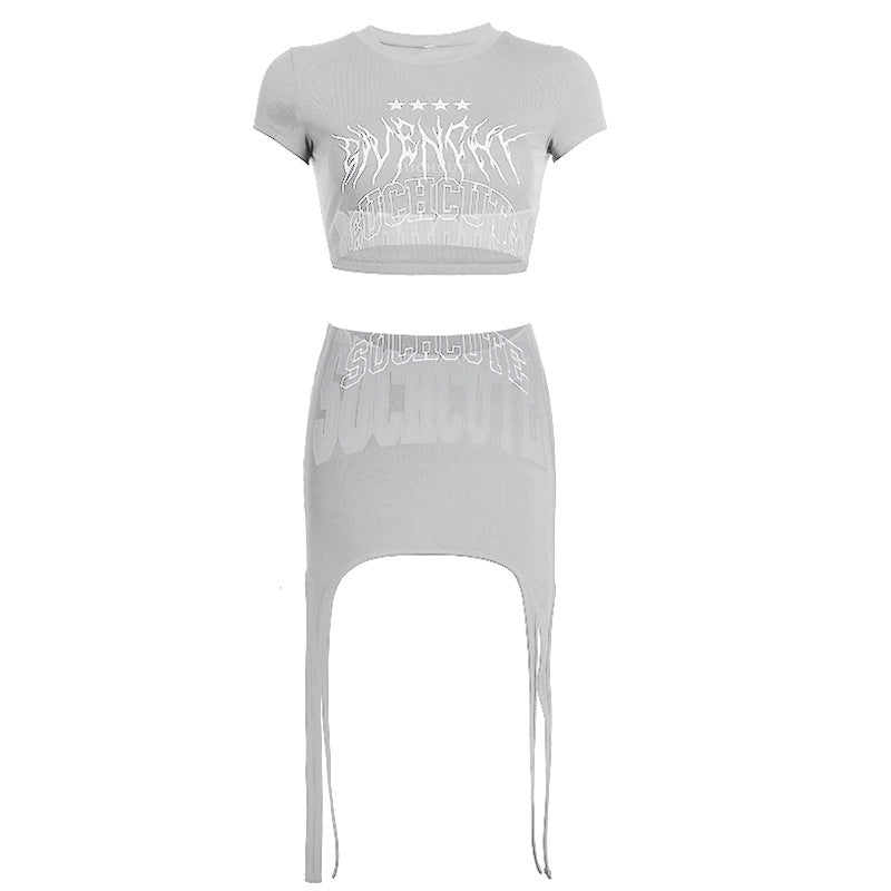 Sexy Bare Midriff Slim Fit T-shirt Irregular Skirt Letters printing 2PC set (CL11370)