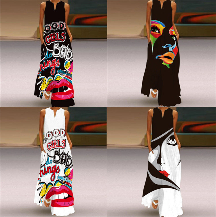Sleeveless Long Dress V-neck Letter Retro Printed Dress (Cl10611)