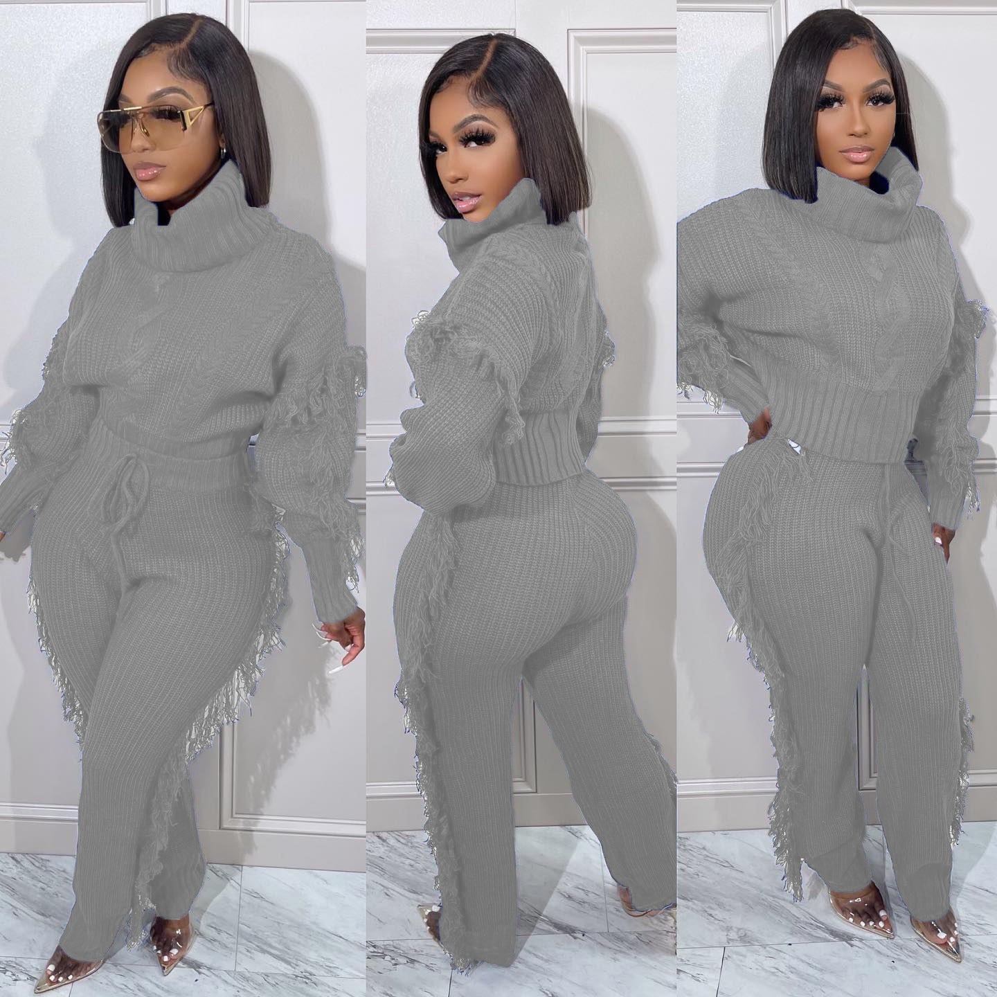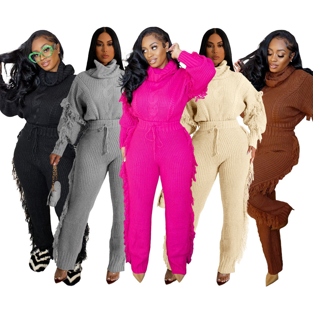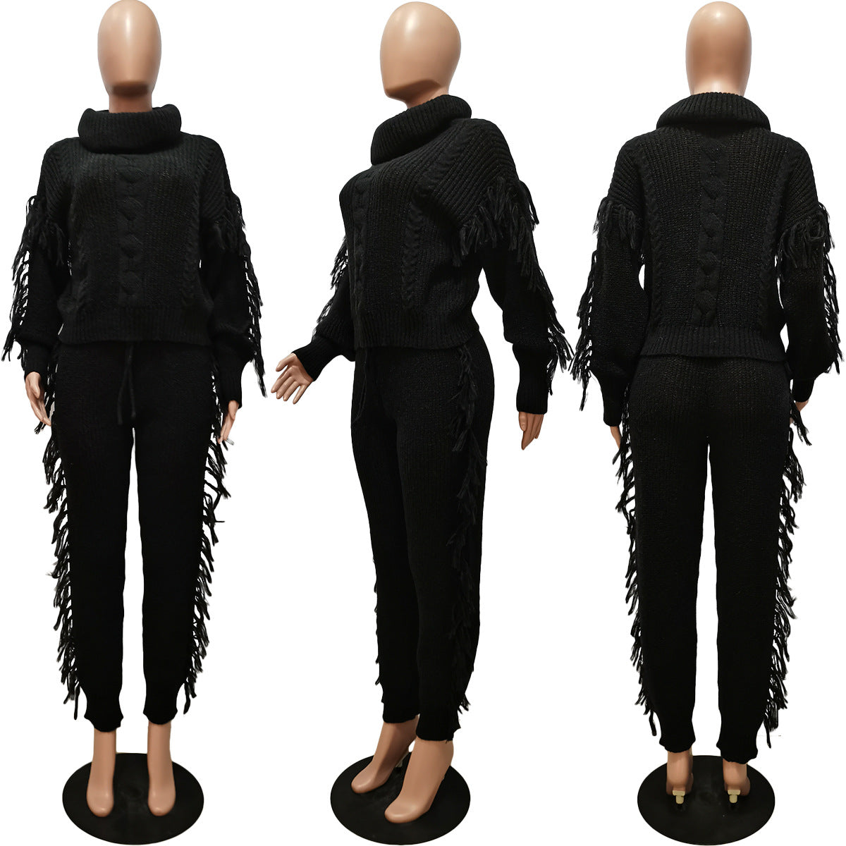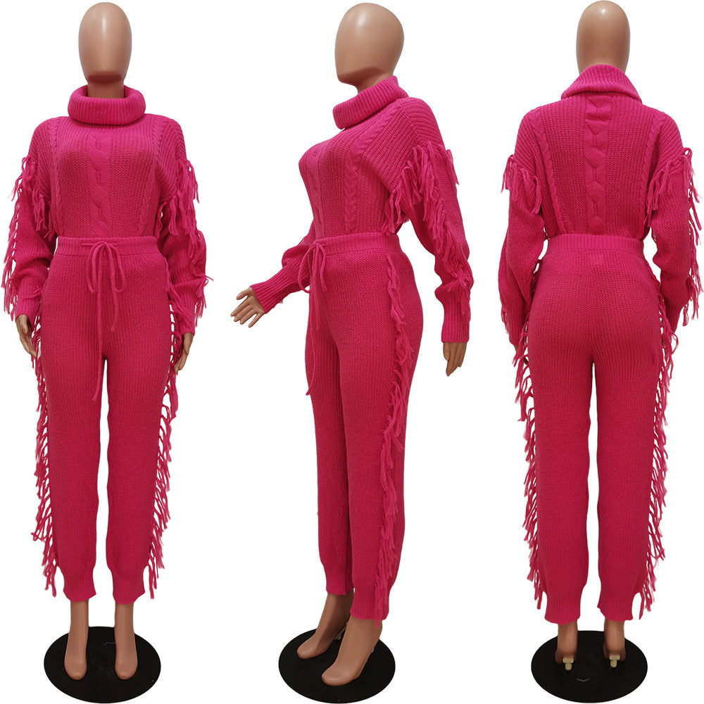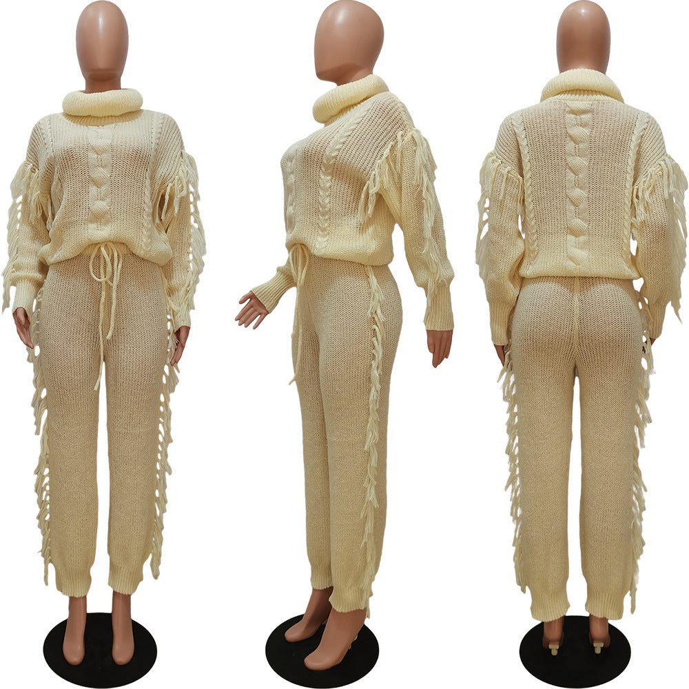 Solid Knitted Long Sleeve High Neck Tassel Set (CL11982)