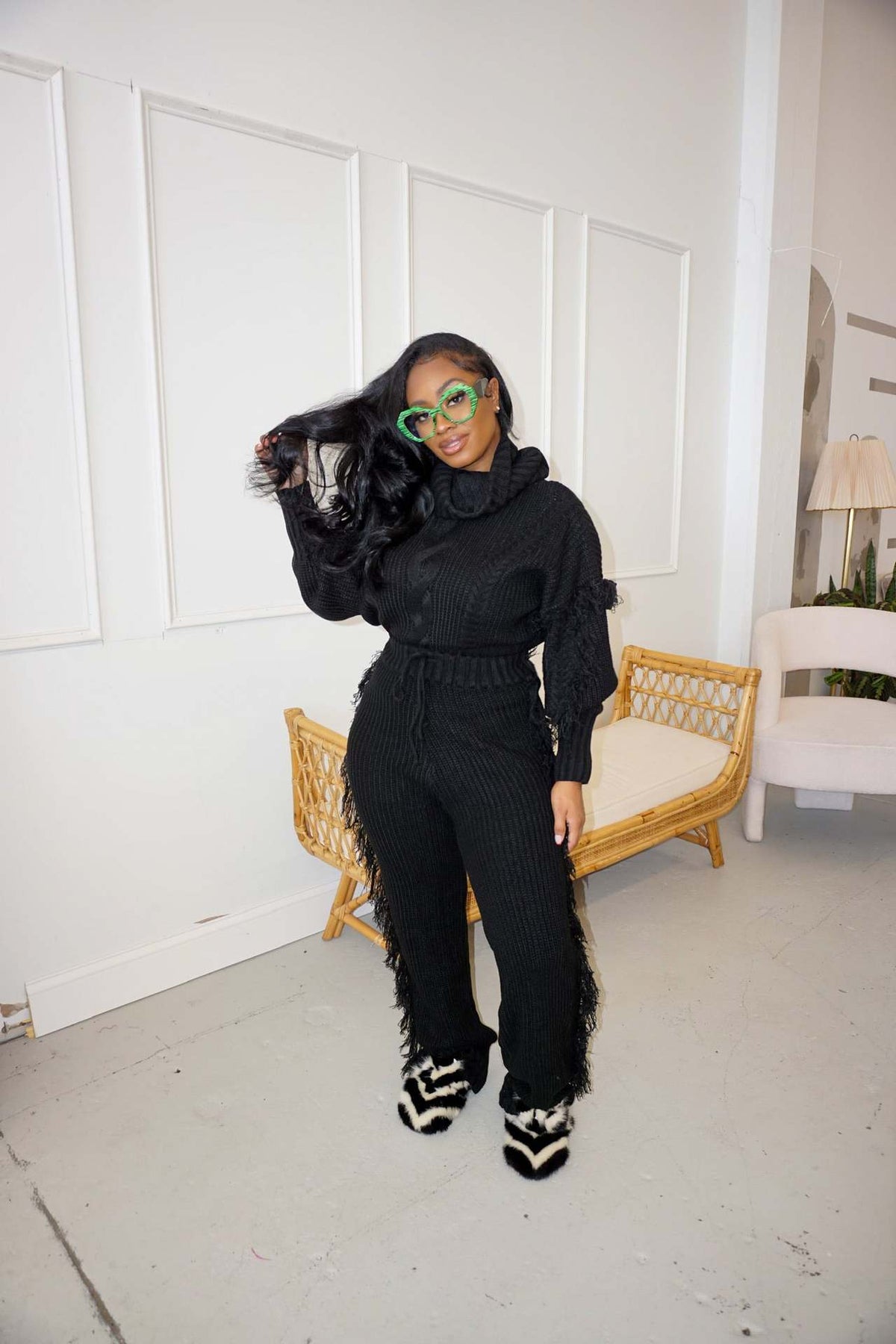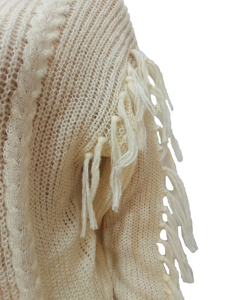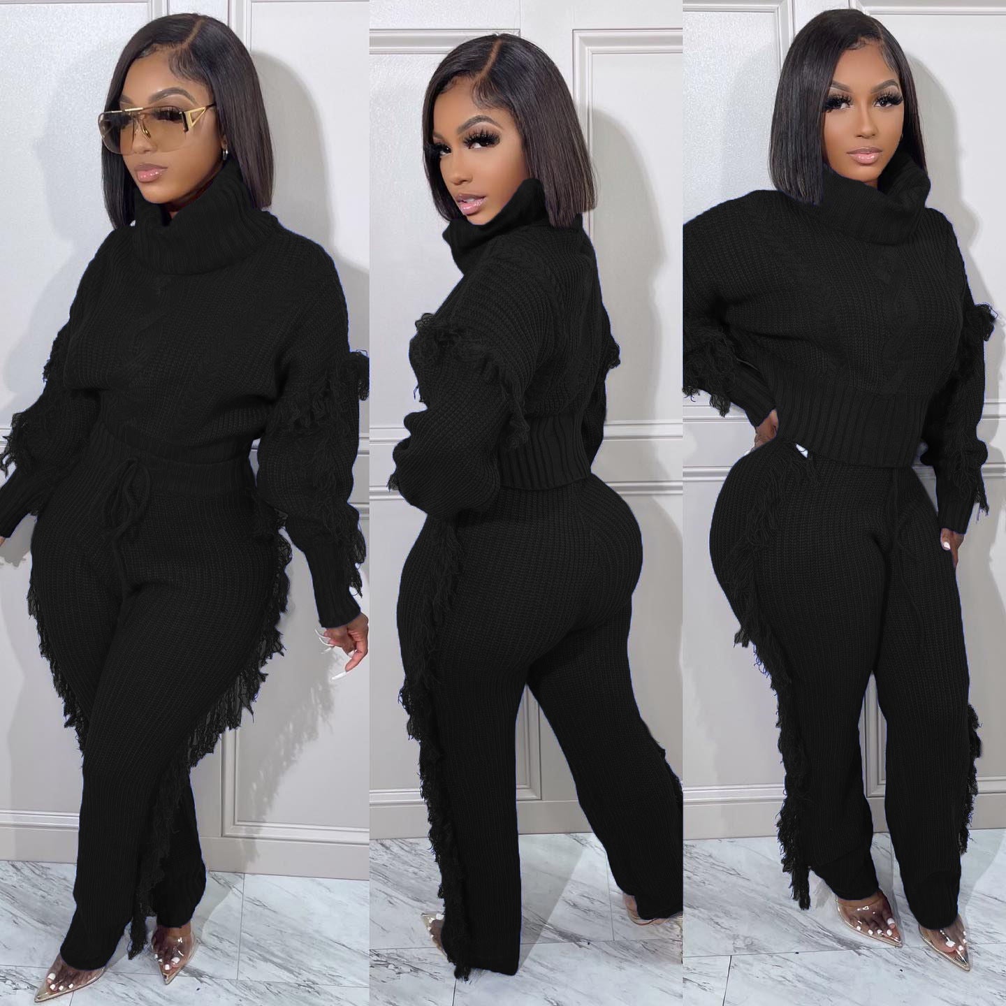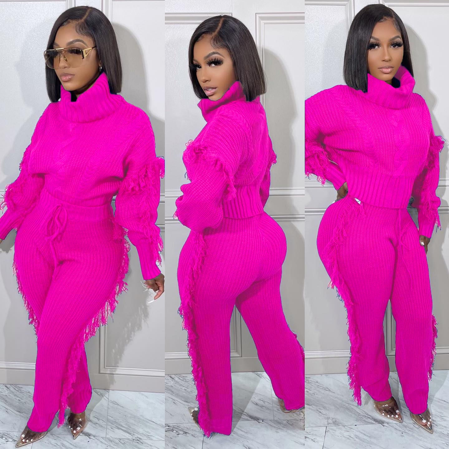 Solid Knitted Long Sleeve High Neck Tassel Set (CL11982)