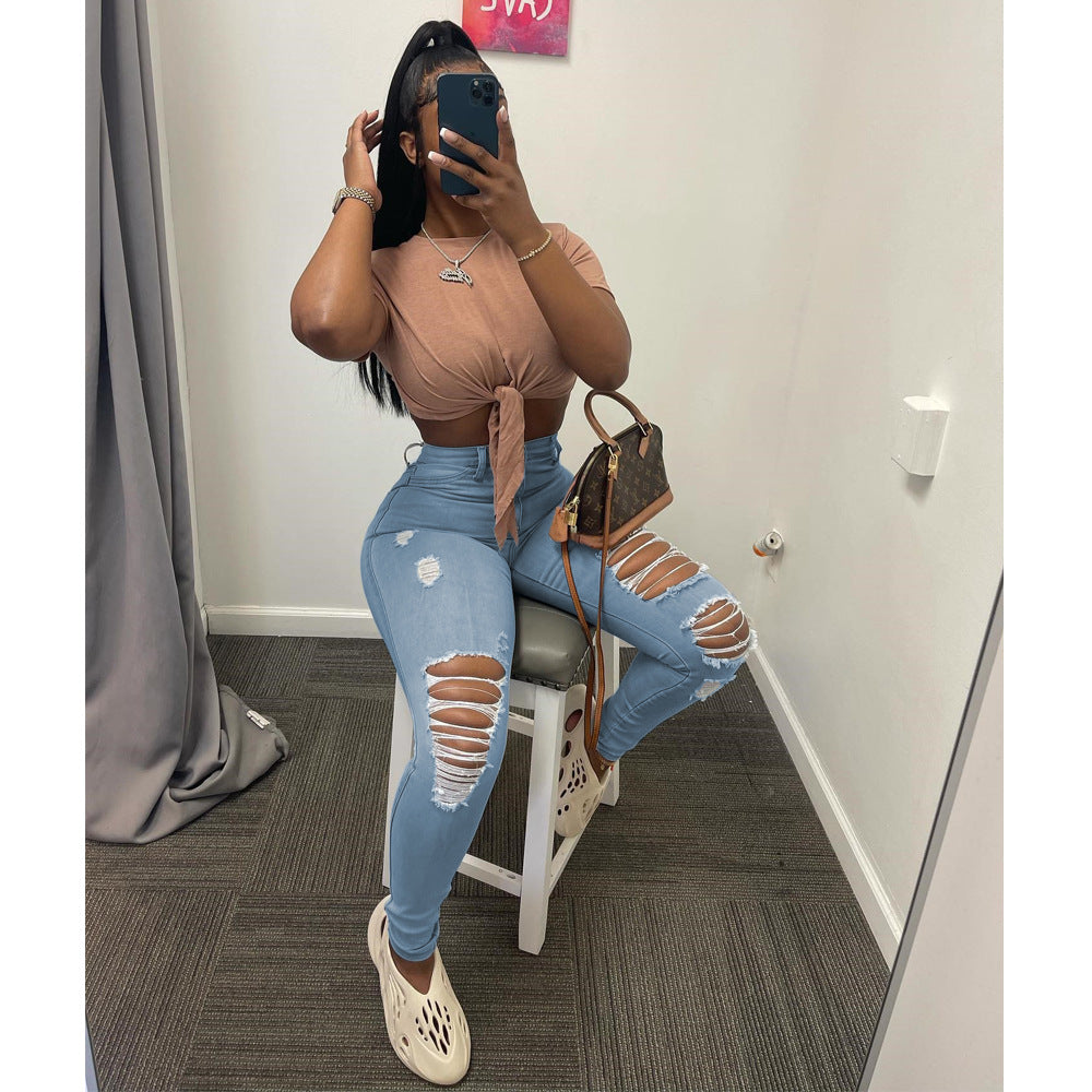 Solid Stretch Distressed Washed Light Blue Jeans (CL11501)