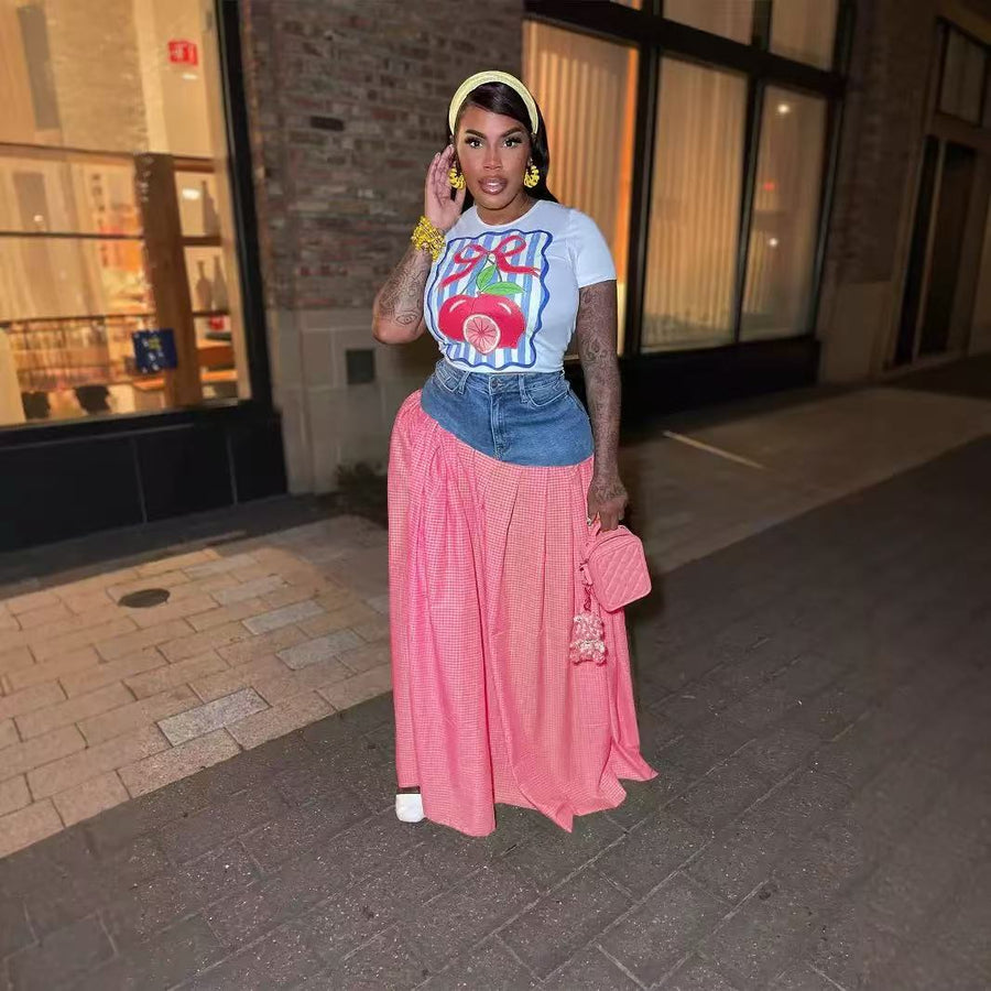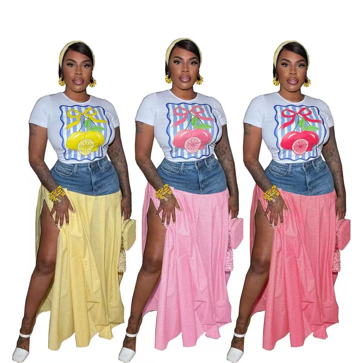 Spice girl T-shirt denim stitching high waist split plaid skirt 2pc set(CL12364)