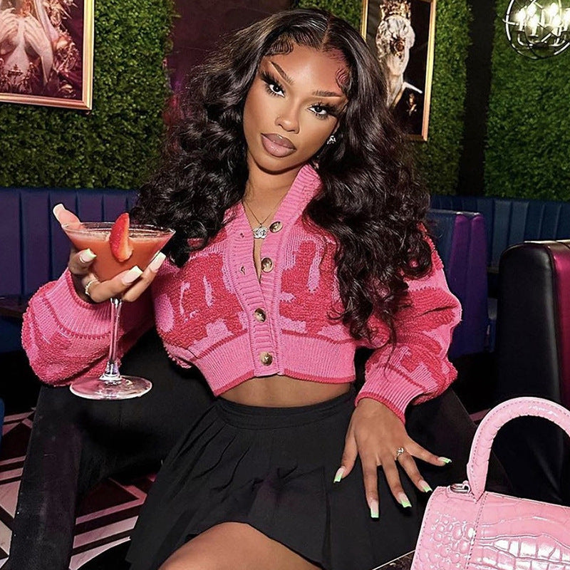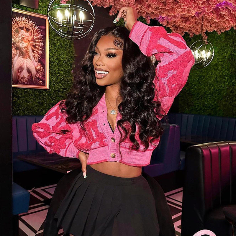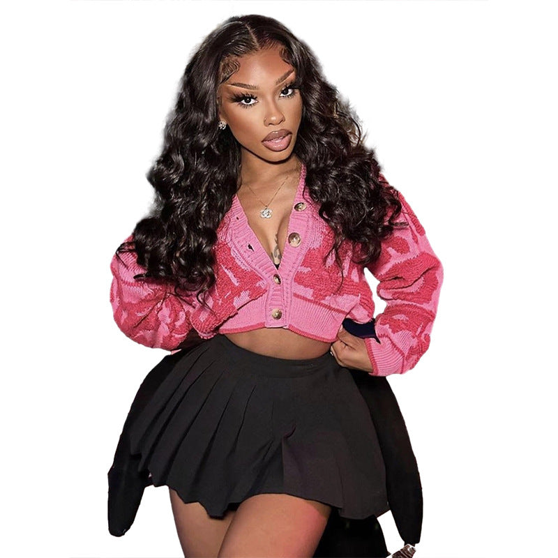 Sweet color-block low-cut V-neck button-up high-rise slim-fit knit top (CL11966)