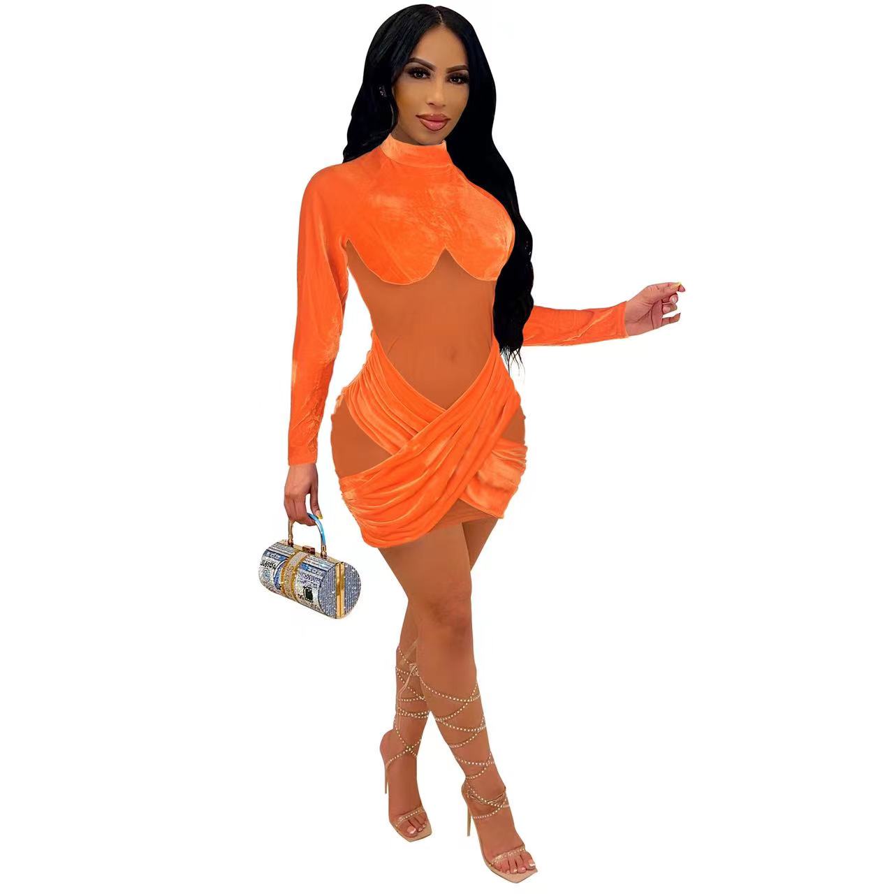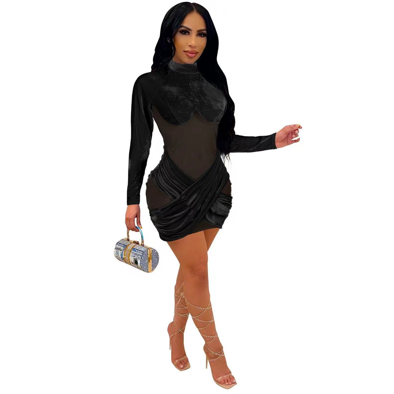 Tight sexy perspective nightclubs do not pour velvet stitching gauze dress.(CL12098)