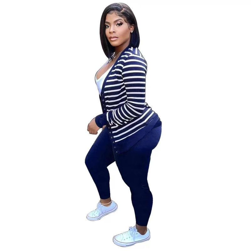 Wholesale fashion stripe button cardigan Pants Set 2PC(CL9640)