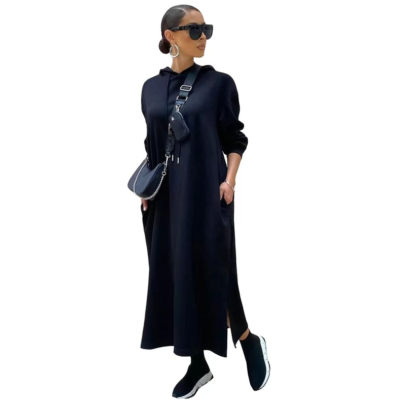 Wholesale solid color color Hooded Sweater dress with split(CL9618)
