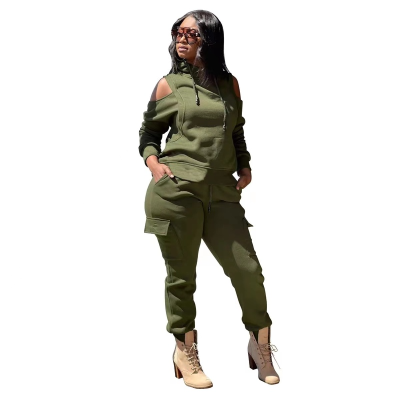 Wholesale sportswear bodysuit off shoulder running suit hooded long sleeve 2PC(CL9474)