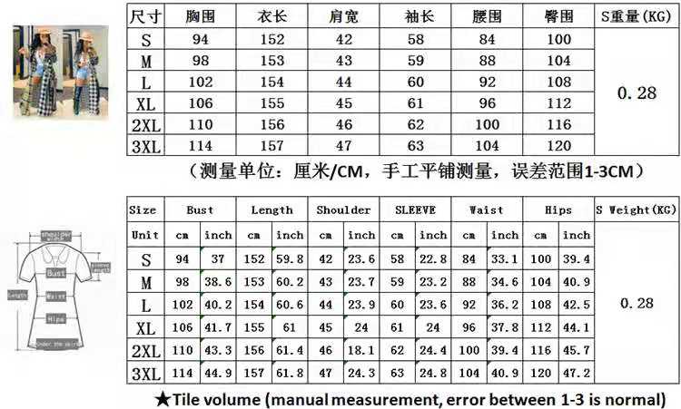 Process: SplicingSize chart(in) Size Bust Length Shoulder Sleeve Waist Hips S 37.00 59.80 16.54 22.80 33.10 39.4 M 38.60 60.20 16.93 23.20 34.60 40.9 L 40.20 60.60 17.32 23.60 36.20 42.5 XL 41.70 61.00 17.72 24.00 37.80 44.1 2XL 43.30 61.40 18.11 24.40 39.40 45.7 3XL 44.90 61.80 18.50 24.80 40.90 47.2 Due to different measurement methods, the size data may have an error of 1-3 cm.
