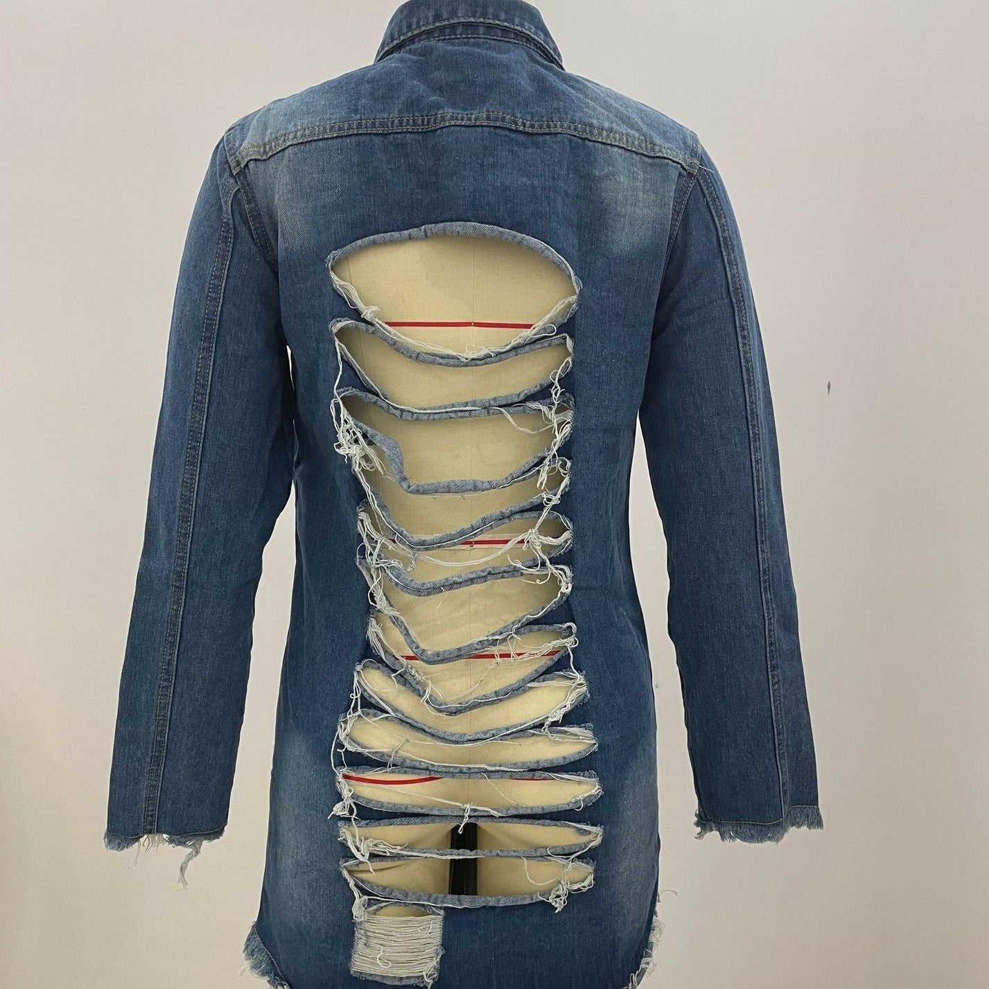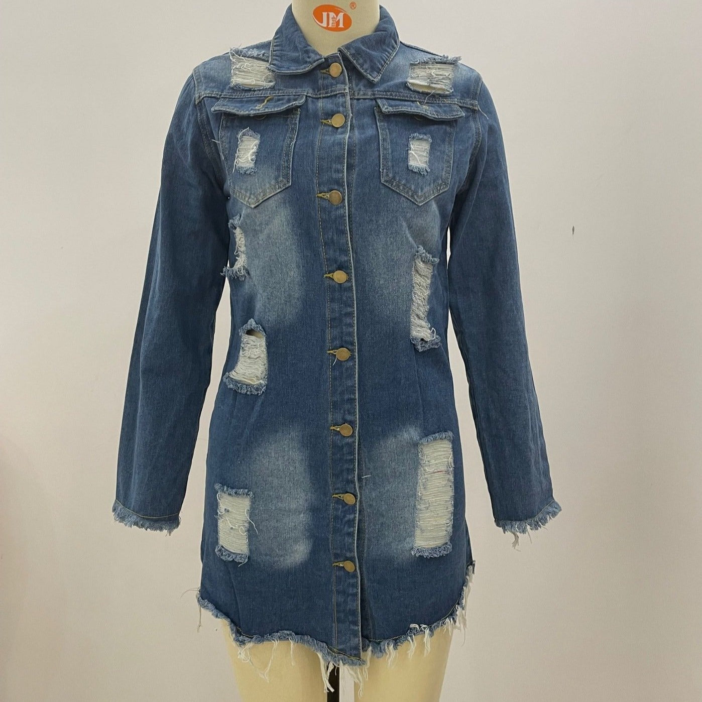 Wholesale women's ripped mid-length denim jacket(CL8299)
