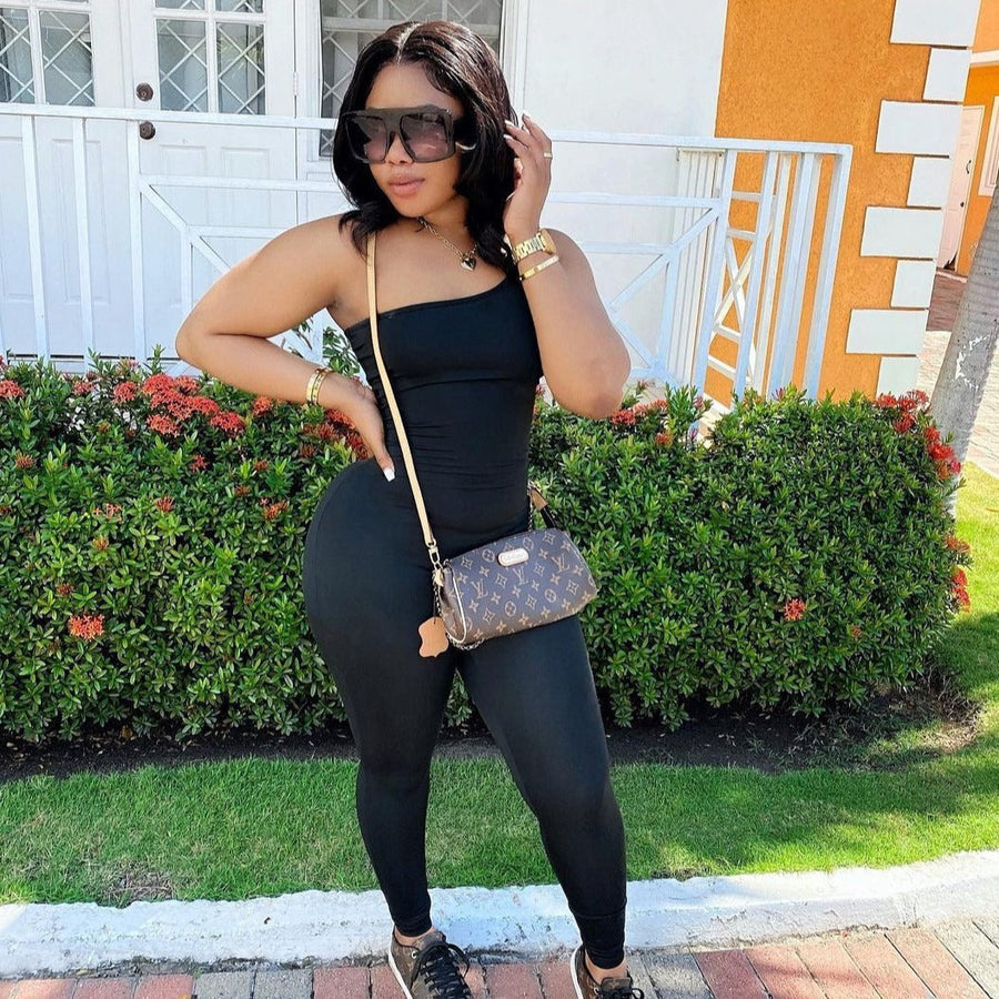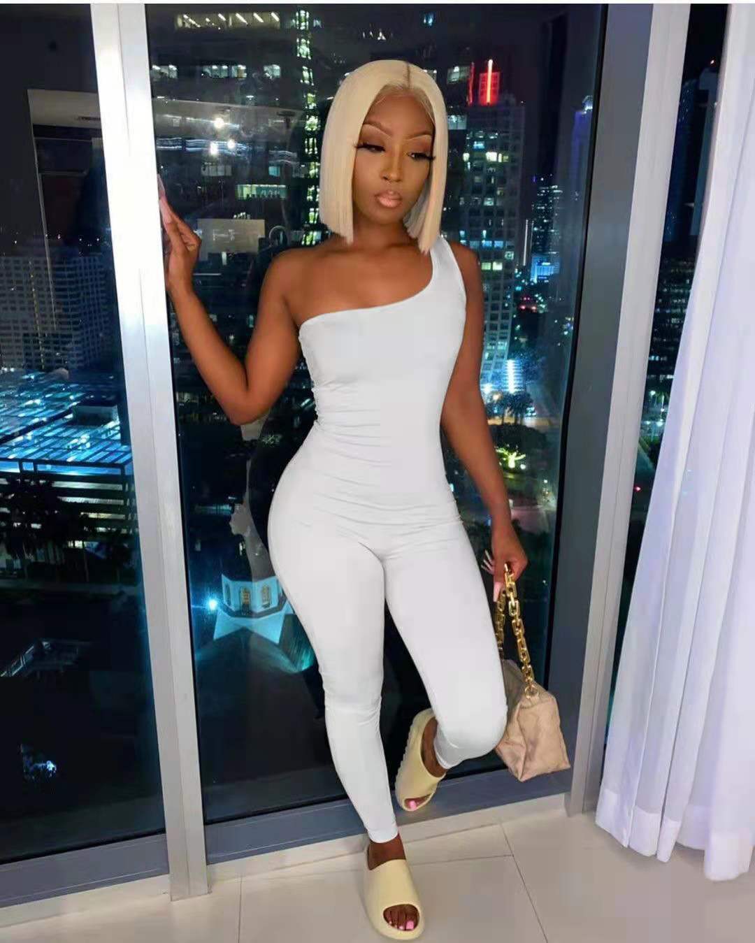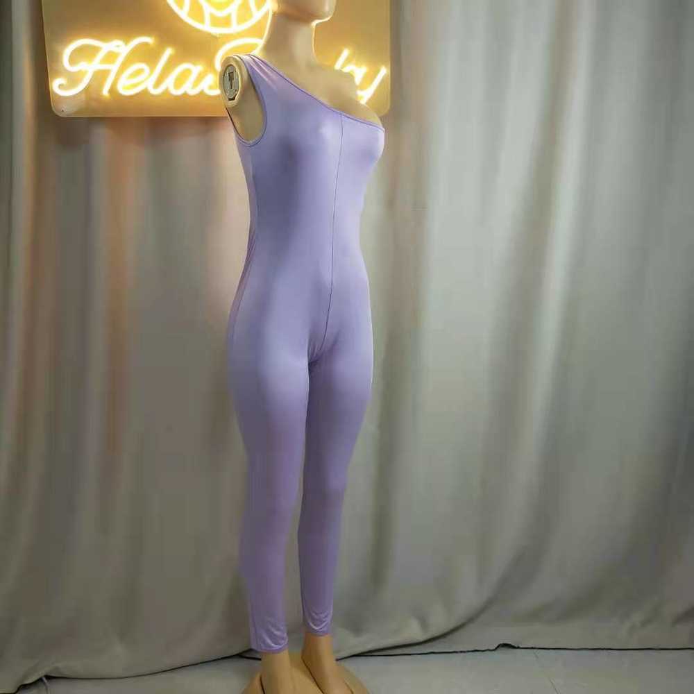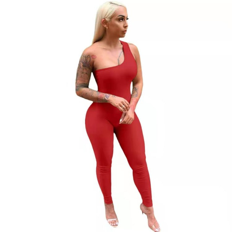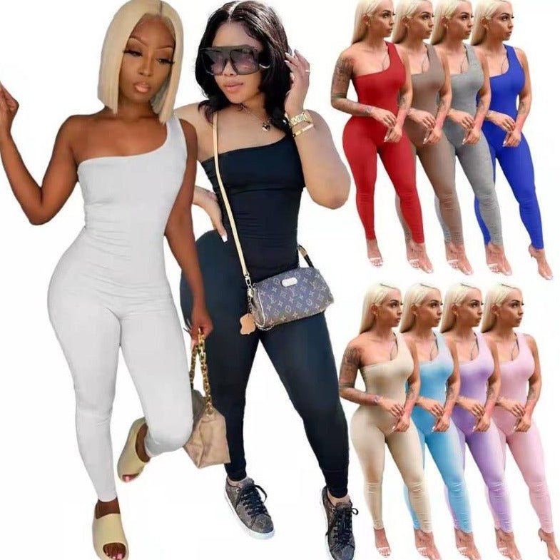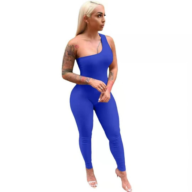 Sleeveless Blank Casual One Shoulder Slim Fit Tight JumpsuitOC8716)